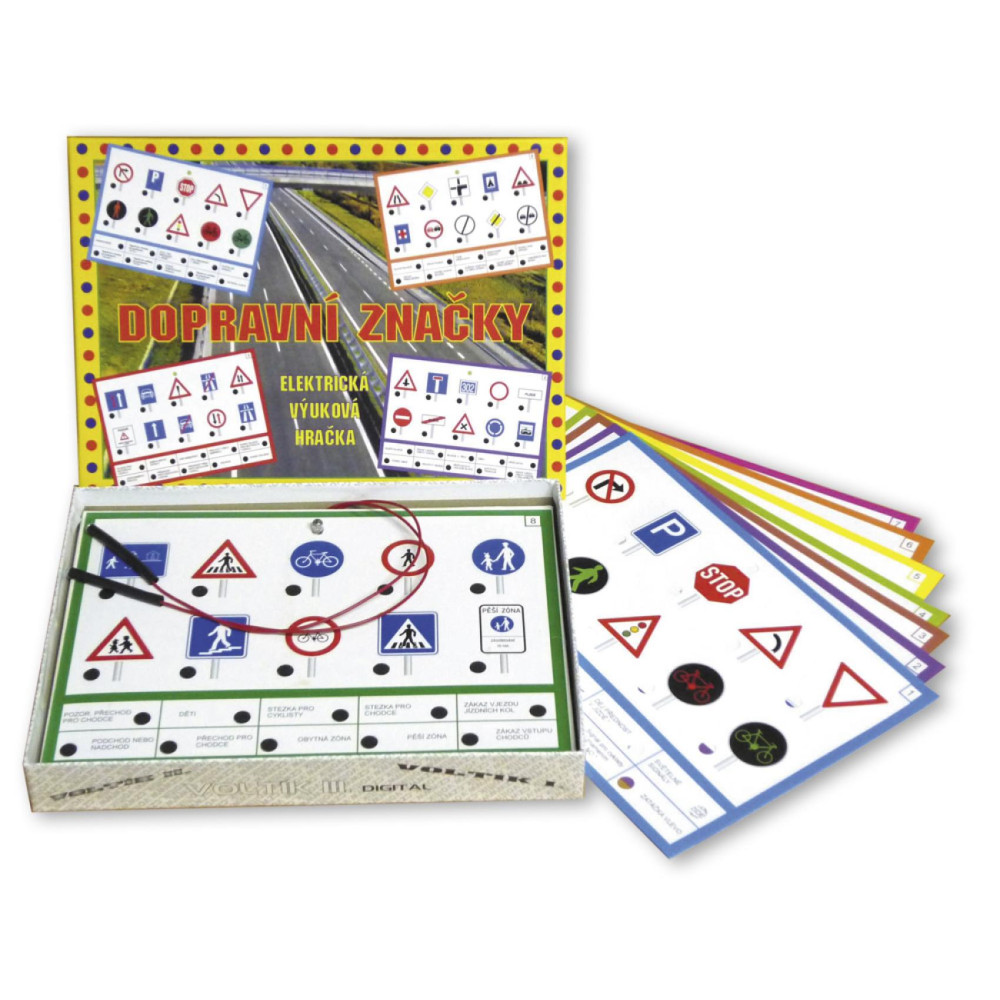 Možná si pamatuje na něco podobného z dětství, kdy jste se učili násobilku pomocí podobné elektrické hry se světýlkem. Společenská hra Dopravní značky přináší hravou formu učení. Hra se skládá z 8 výměnných listů s obrázky a názvy 80 nejběžnějších dopravních značek. Cílem je přiřadit ke každé značce správný název a kladná odpověď se potvrdí rozsvícením žárovičky. S takovým pomocníkem se každý naučí dopravní značky coby dup.