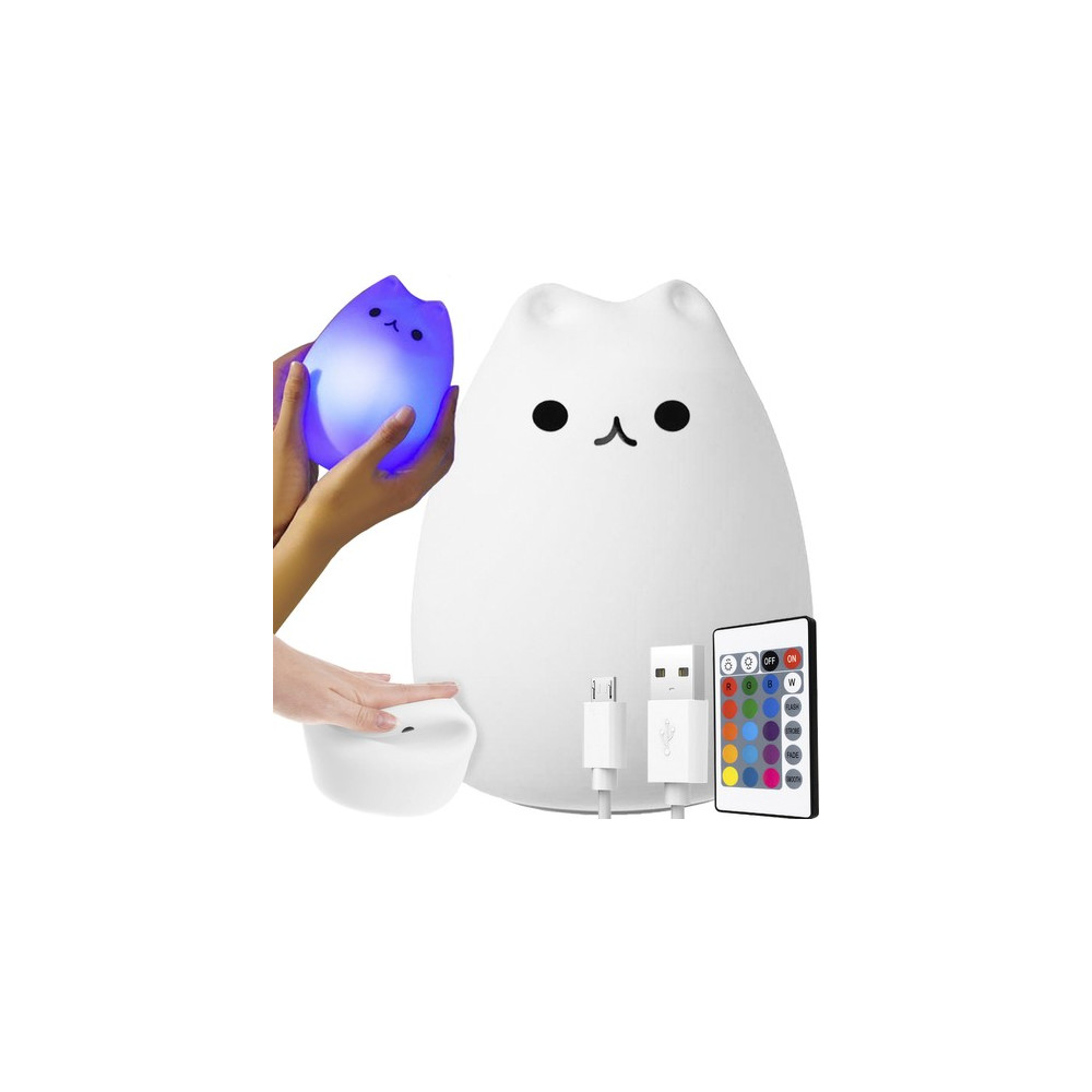 Noční lampička v designu kočičky má 9 režimů jasu a 16 barev na výběr. Možnost výběru barvy světla umožňuje vytvořit v dětském pokoji nevšední atmosféru. Lampička se ovládá pomocí přiloženého dálkového ovladače. Díky tomu můžete například lampičku zhasnout pootevřenými dveřmi do dětského pokoje bez rizika, že se dítě probudí.