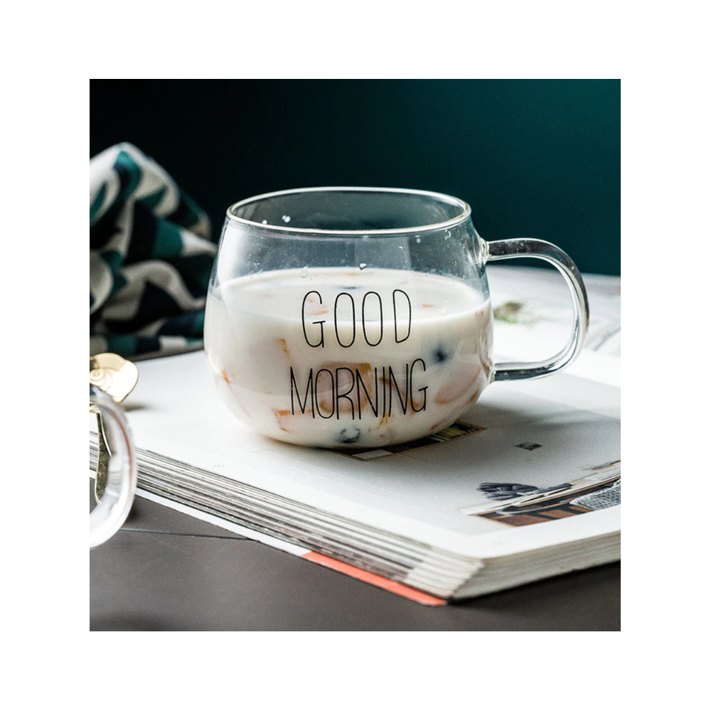 Skleněná hrneček s nápisem Good morning tedy dobré ráno. Hrníček je vhodný na teplé i studené nápoje či na malou svačinku. Po umytí otřete do sucha, zabráníte tak vzniku skvrn od vodního kamene.