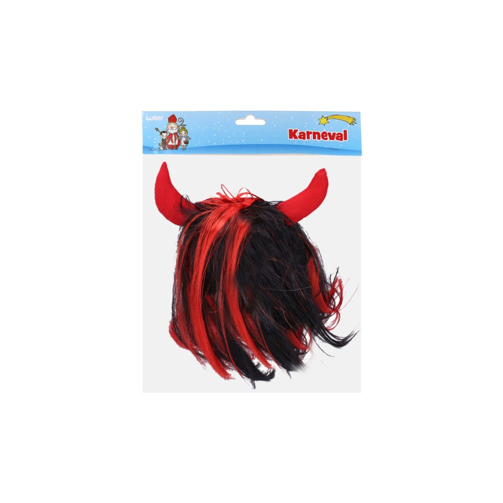 Maškarní paruka s červeno černými rovnými vlasy a červenými textilními rohy. Ideální doplněk ke kostýmu za čerta.