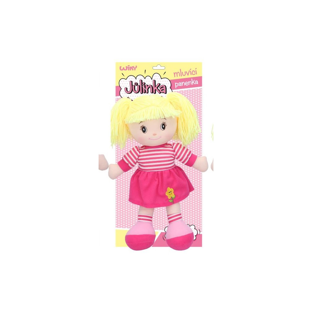 Ahoj, já jsem tvoje panenka Jůlinka. Budeme si spolu hrát celý den a naučíme se spoustu říkanek! Stačí stlačit bříško a povím Ti 4 české říkanky. Panenka Jůlinka bude tvou novou kamarádkou, se kterou se naučíš nejznámější písničky a užiješ legraci. Tak kterou si vybereš? Látkovou panenku s roztomilým obličejem, velkými kukadly, krásnými šatičkami a vlásky z vlny si oblíbí všechny malé slečny! Díky měkkému tělíčku i hlavičce může být kamarádkou nejen při hraní, ale také při usínání!