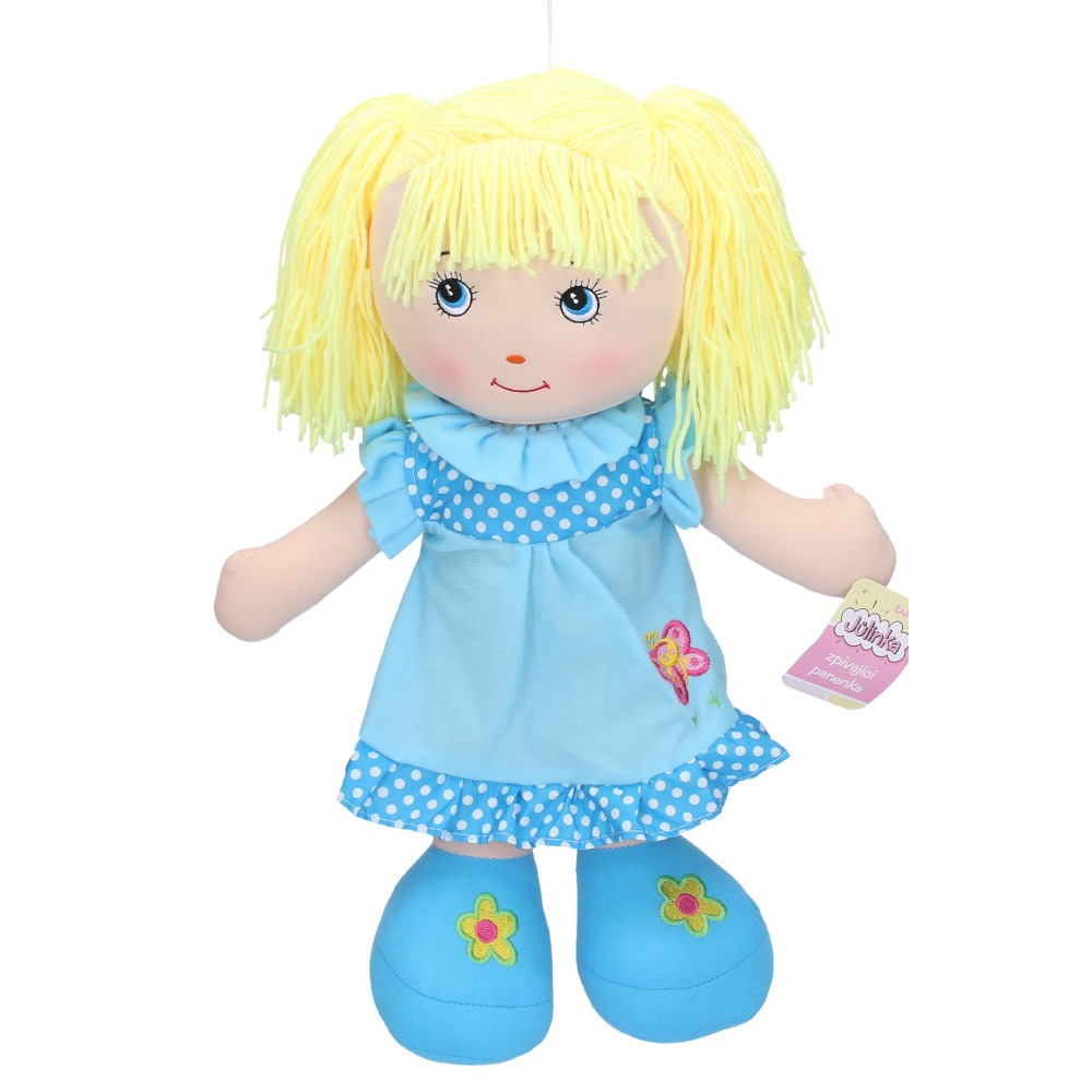 Ahoj, já jsem tvoje panenka Jůlinka a budeme si zpívat! Stačí stlačit bříško a zazpívám ti 6 krásných českých písniček. Panenka Jůlinka bude tvou novou kamarádkou, se kterou se naučíš nejznámější písničky a užiješ legraci. Tak kterou si vybereš? Látkovou panenku s roztomilým obličejem, velkými kukadly, krásnýma šatičkami a vlásky z vlny si oblíbí všechny malé slečny. Díky měkkému tělíčku i hlavičce může být kamarádkou nejen při hraní, ale také při usínání.