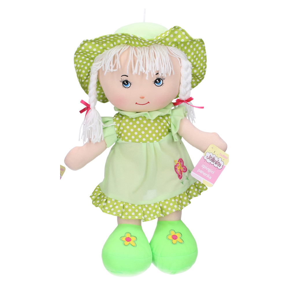Ahoj, já jsem tvoje panenka Jůlinka a budeme si zpívat! Stačí stlačit bříško a zazpívám ti 6 krásných českých písniček. Panenka Jůlinka bude tvou novou kamarádkou, se kterou se naučíš nejznámější písničky a užiješ legraci. Tak kterou si vybereš? Látkovou panenku s roztomilým obličejem, velkými kukadly, krásnýma šatičkami a vlásky z vlny si oblíbí všechny malé slečny. Díky měkkému tělíčku i hlavičce může být kamarádkou nejen při hraní, ale také při usínání.
