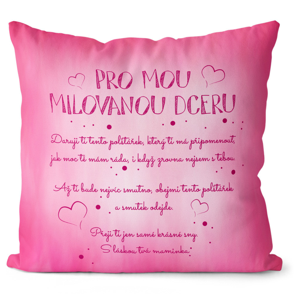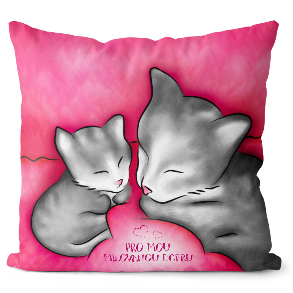 Originální polštářek s vtipným textem a motivem. Má oboustranný potisk kdy na každé straně polštářku je obrázek s kočičkami a na druhé vepsané věnování, se zapínáním a vyjímatelnou výplň. Polštářek s motivem pro dceru.