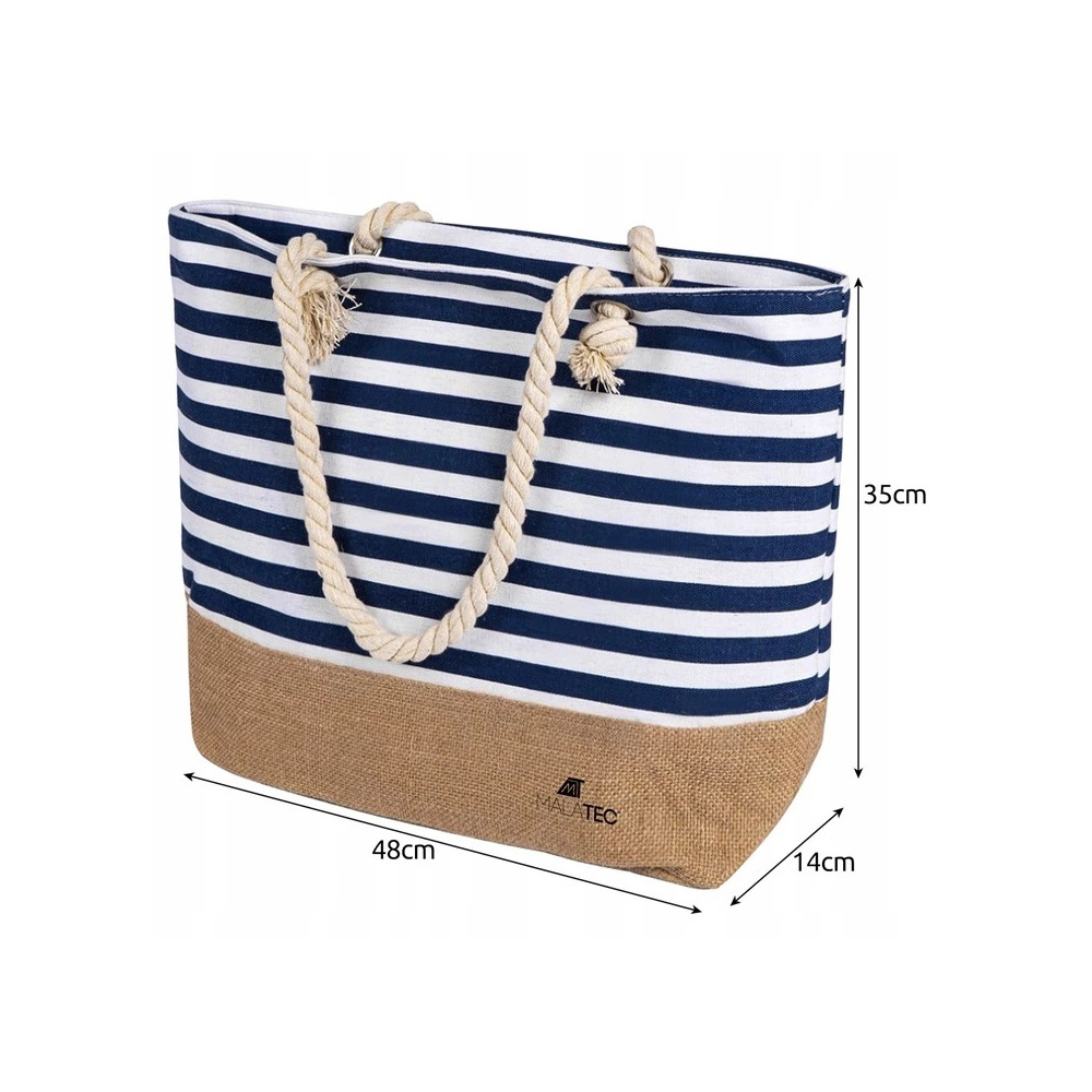 Taška v námořnickém stylu v tmavě modré barvě s bílými pruhy. Plážová taška je praktickým a stylovým doplňkem, který vám umožní pohodlně nosit všechny potřebné věci na pláž a poskytuje dostatečnou ochranu proti vodním podmínkám.