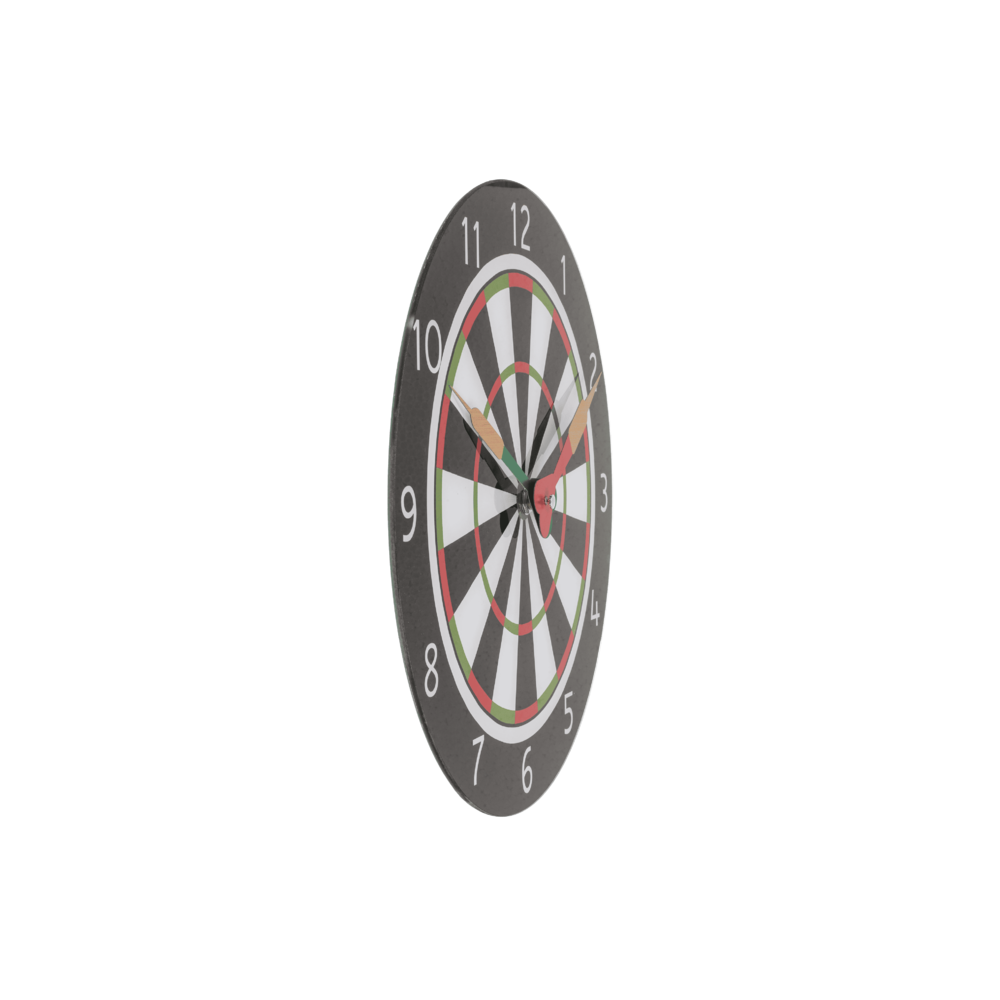 Nástěnné hodiny, které mají místo ručiček šipky a pozadí vypadá jako opravdový terč. Ideální dekorace pro milovníky této zábavy.