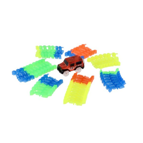 Sestavte si parádní dráhu dle své fantazie a pusťte autíčko na cestu! Nebojte, že by se Vám zatoulalo, bude přesně kopírovat každý kousek dráhy. S úžasnou neonovou závodní dráhou, která se dá ohýbat a otáčet, navíc svítí ve tmě zažijete opravdové závody! Do autíčka, které má tři blikající světla a je super rychle musíte dát baterii.