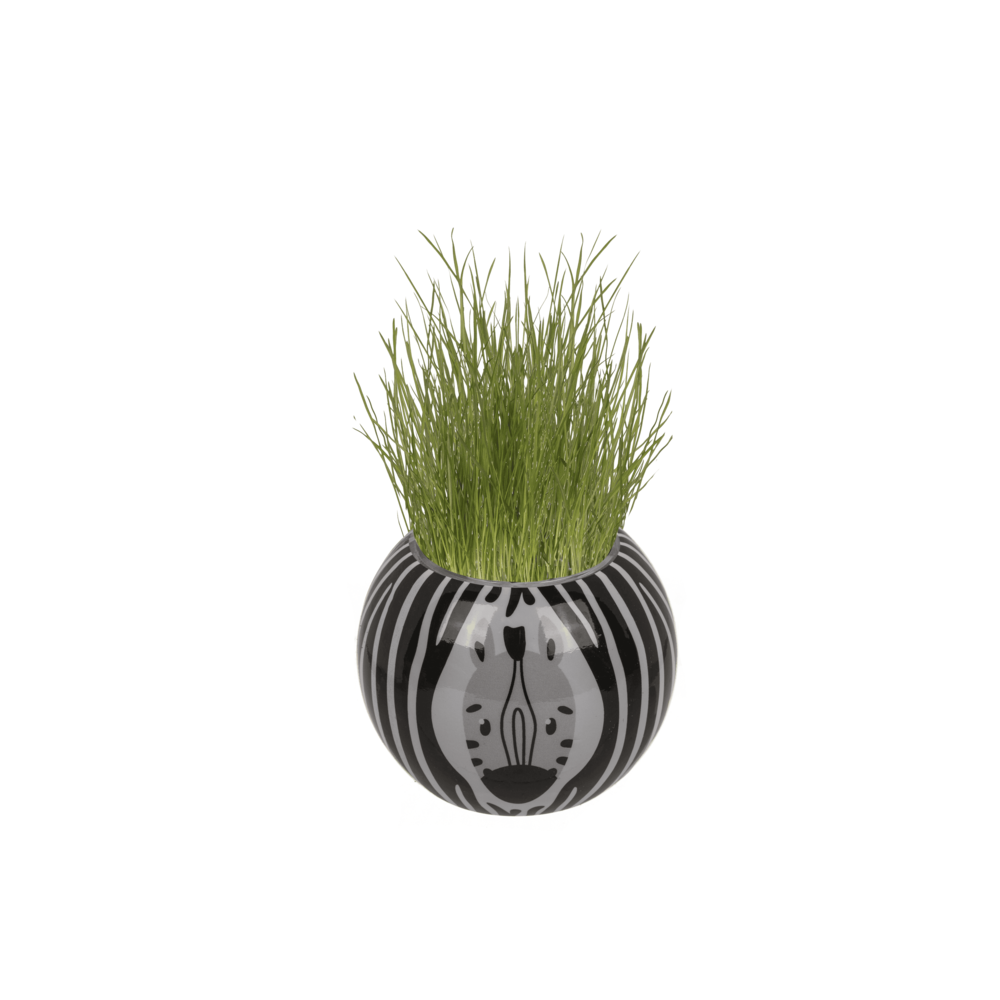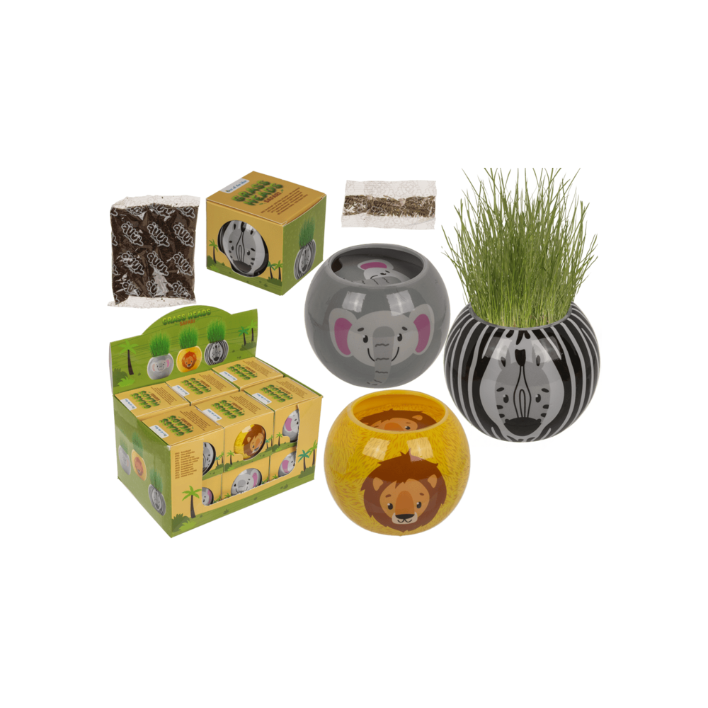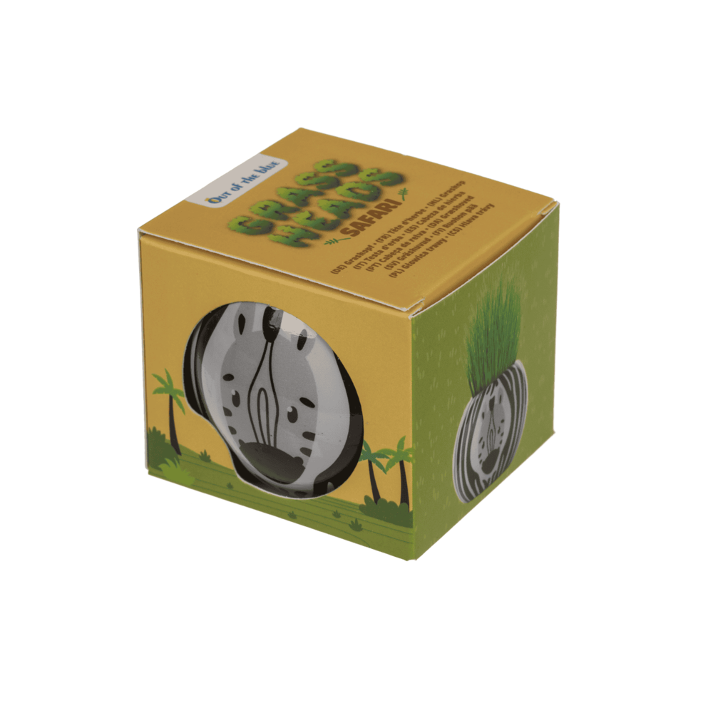 Plastový květináček s motivem zvířátka ze Safari, ze kterého si vypěstujete trávu. Tento travňák je balen v papírové krabičce a obsahuje již vše potřebné k vypěstování trávy (semena a zemina).