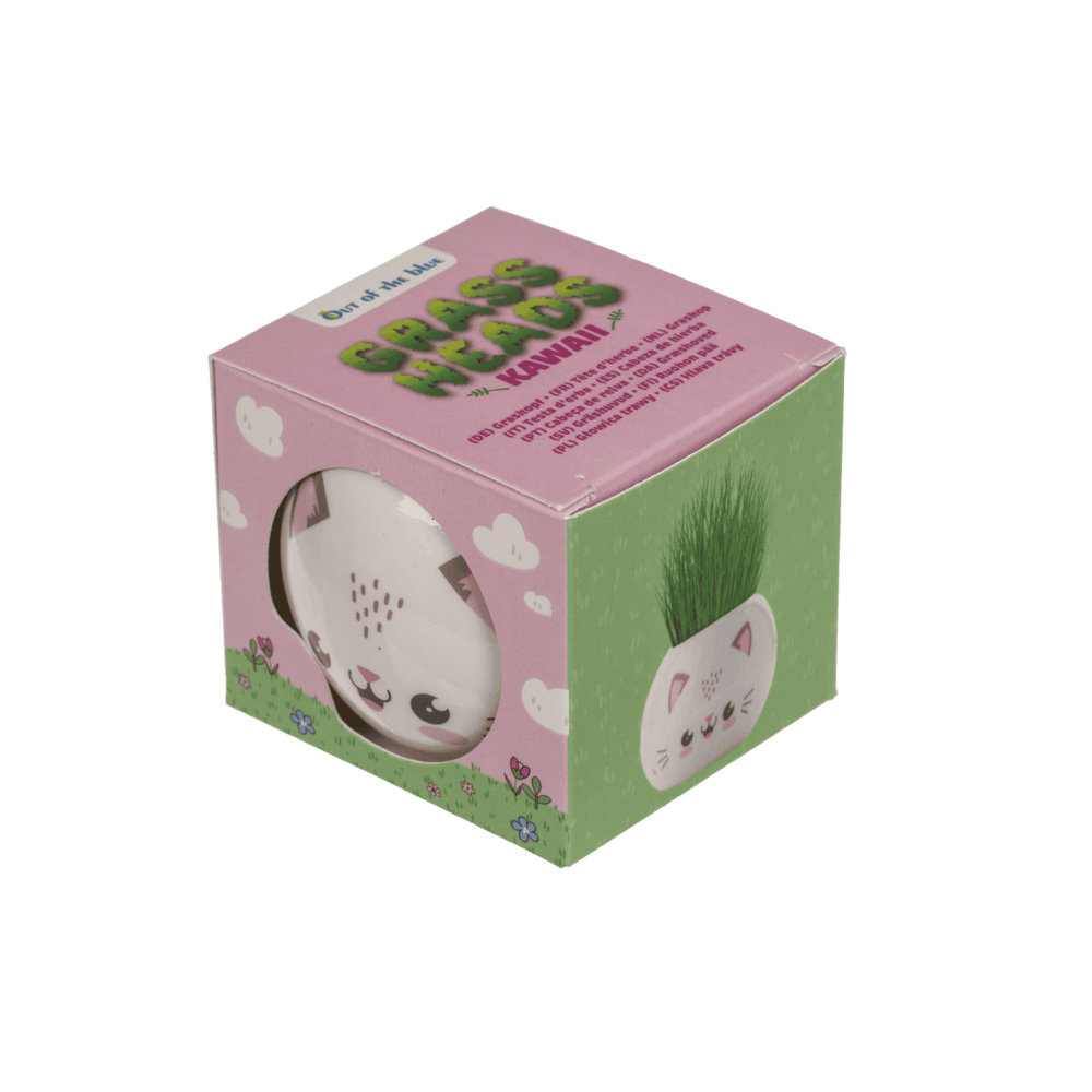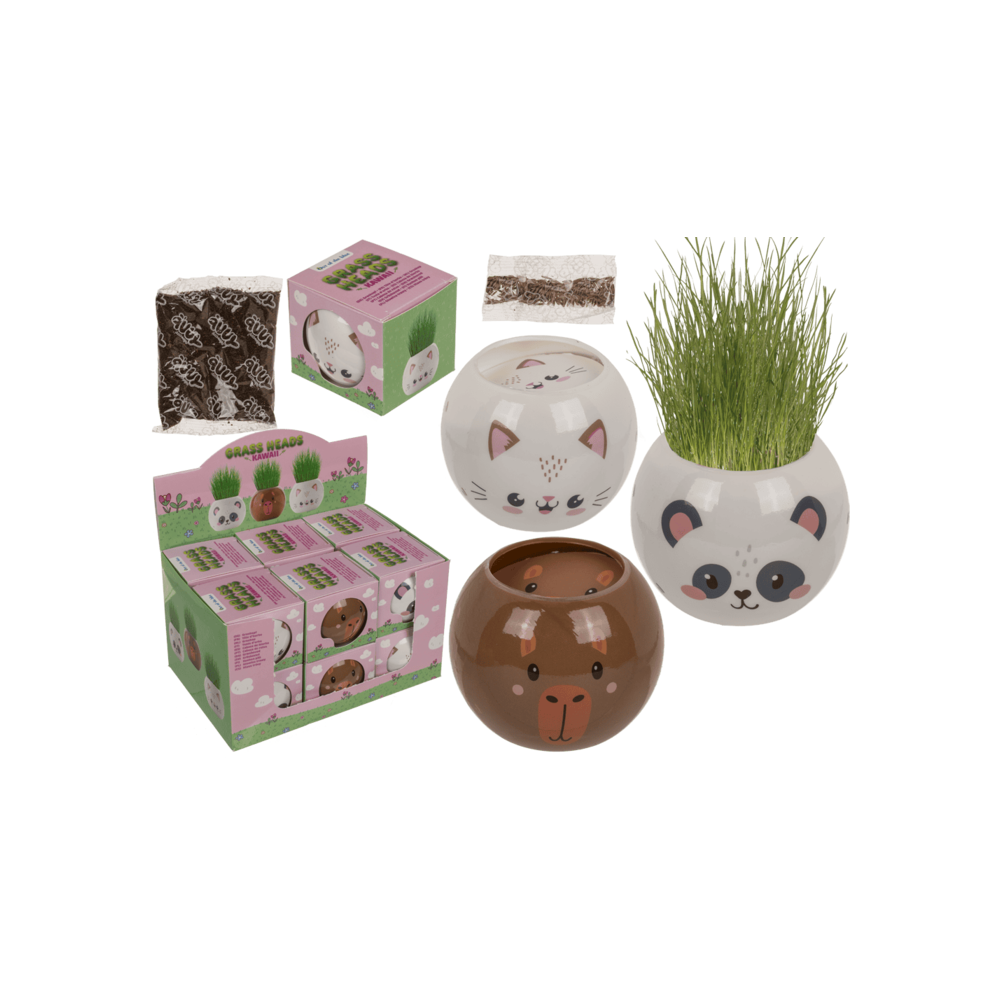 Plastový květináček s motivem roztomilých zvířátek, ze kterého si vypěstujete trávu. Tento travňák je balen v papírové krabičce a obsahuje již vše potřebné k vypěstování trávy (semena a zemina).