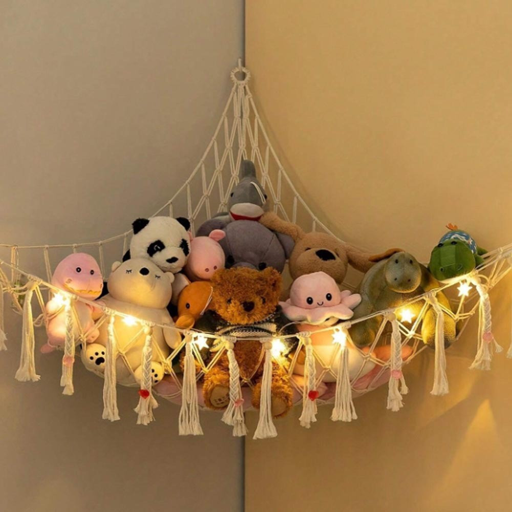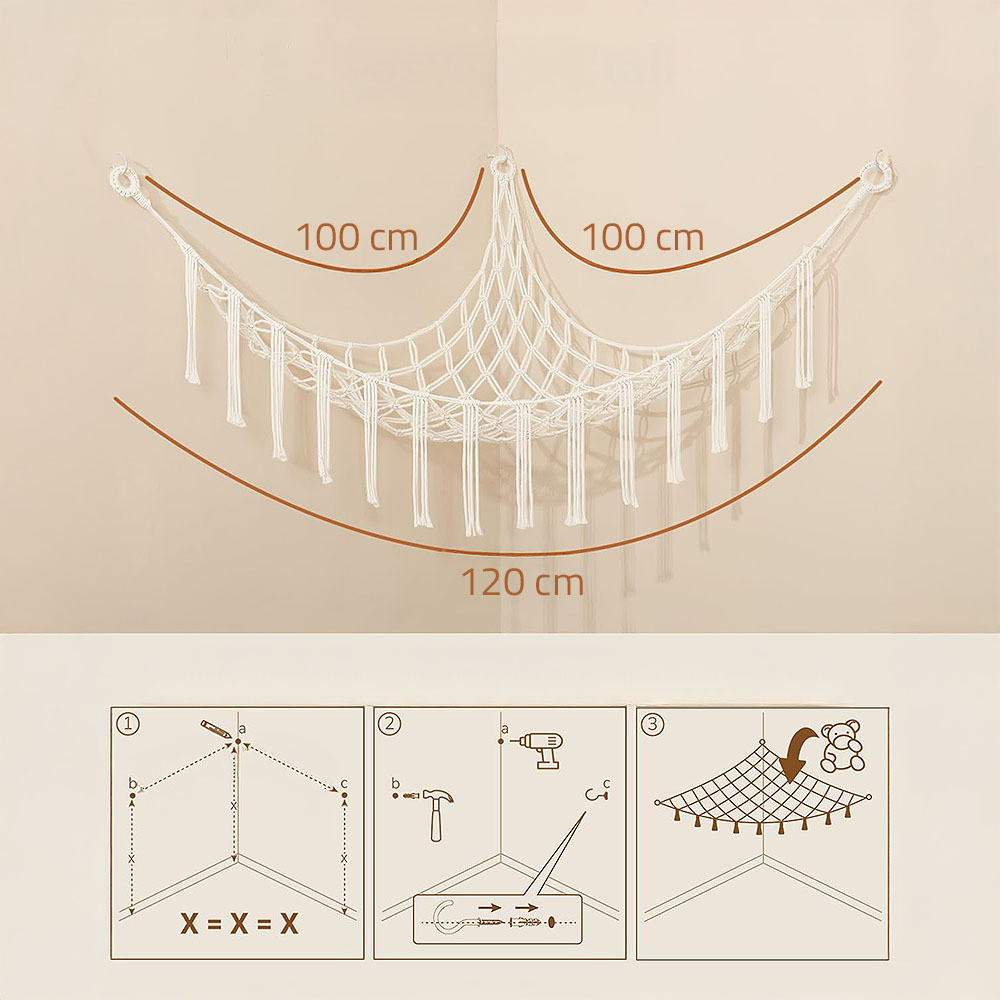 Závěsná síť do rohu místnosti je praktickým a dekorativním způsobem, jak uklidit hračky, polštáře či dekorace. Styl boho macramé dodá interiéru útulnost a montáž zvládnete během chvilky. Skvělé řešení pro úsporu místa a udržení pořádku.