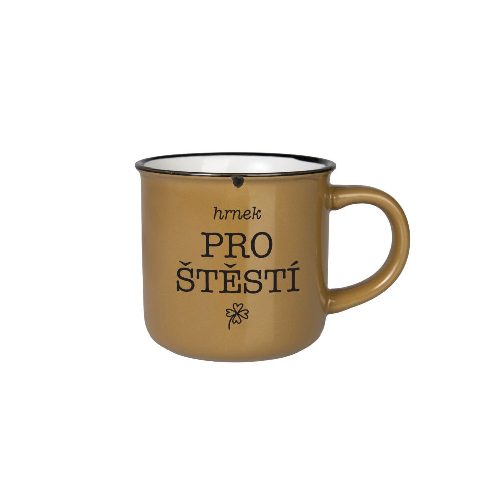 Barevný kameninový hrnek s textem ve vzhledu plecháčku. Výhodou kameniny je, že je těžší, stabilní a dobře udržuje teplo.
