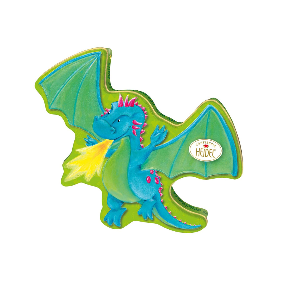 Plechová dóza s reliéfem v designu draka uvnitř schovává několik čokoládových bonbónů. V balení najdete pralinky z mléčné čokolády s mléčnou krémovou náplní (36%).