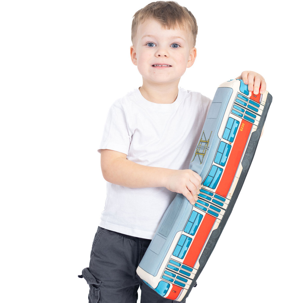Plyšová tramvaj je vyrobena z příjemného materiálu Velvet, který je heboučký a velmi příjemný na dotek. Uvnitř je pak molitan střední tuhosti, který zajistí příjemný komfort při ležení na hračce. Povlak je snímatelný se zipem ve spodní části hračky.
