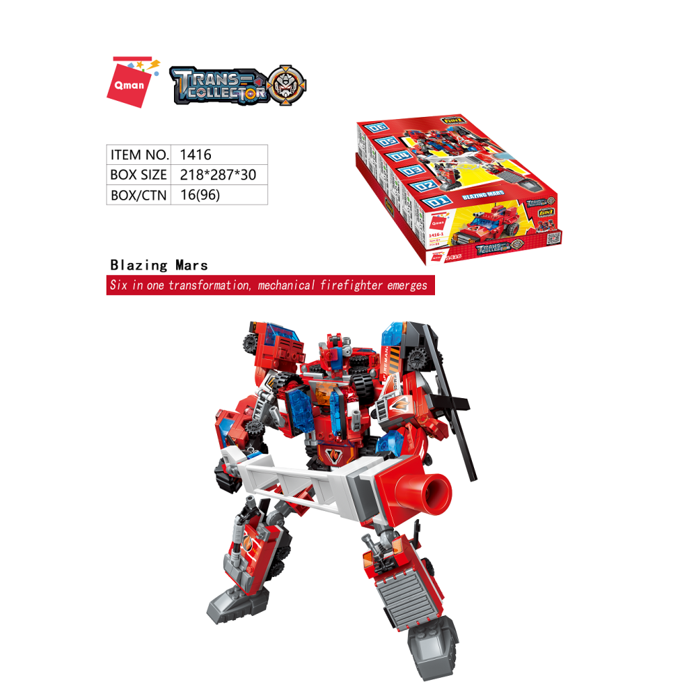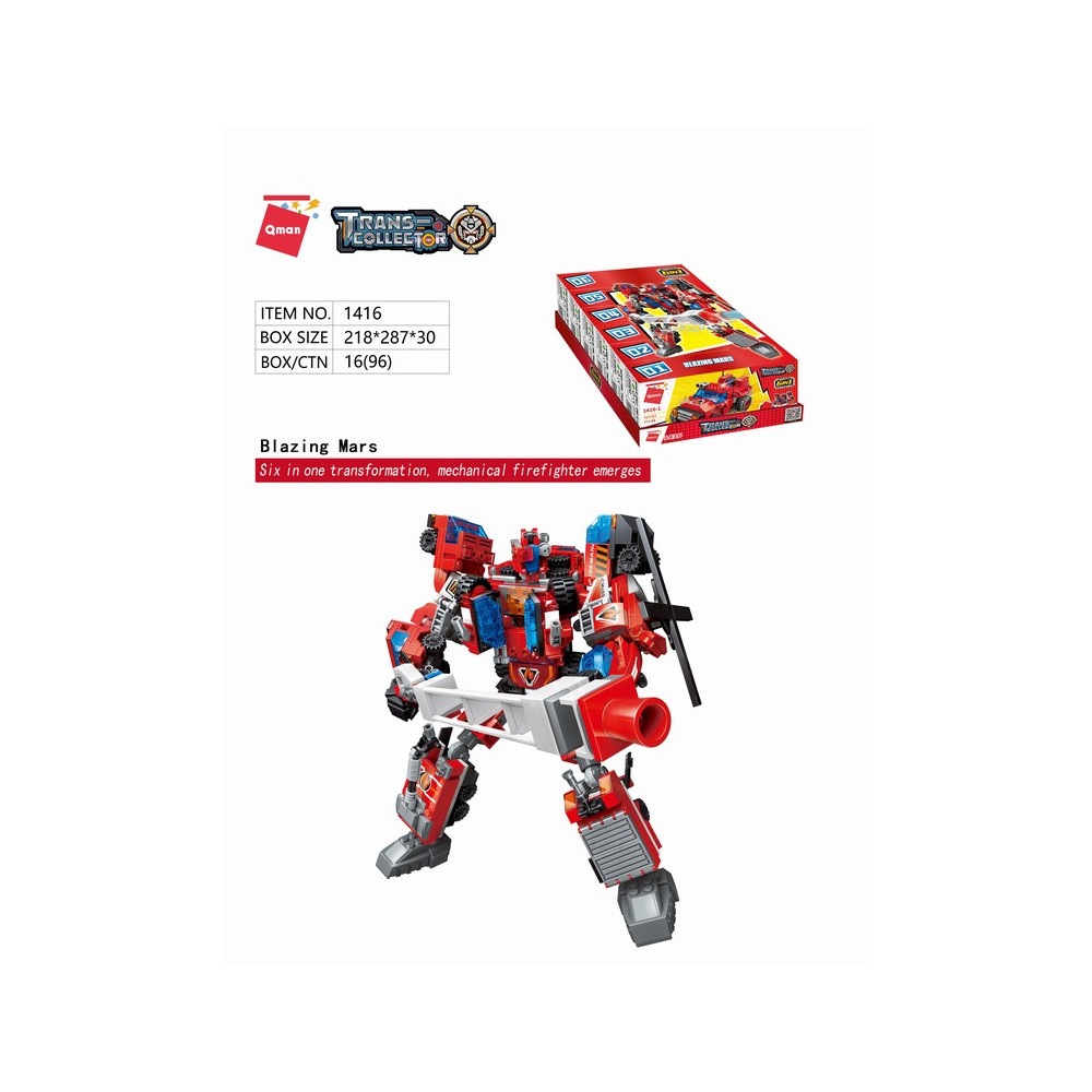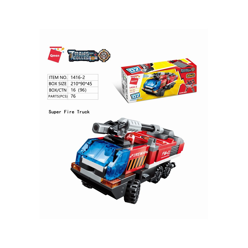 Sbírejte, kombinujte a pozvedejte stavbu i hru na vyšší úroveň! Sada ministavebnic hasičské techniky, jejichž kombinací vznikne možnost sestavit velký ucelený model hasičského mecha. Vysoce variabilní stavebnice Qman z pestrobarevných plastových kostiček lze kombinovat s podobnými stavebnicemi mnoha dalších významných výrobců. Vyrobeno z kvalitního, nezávadného a odolného ABS plastu.
