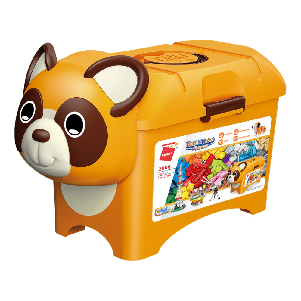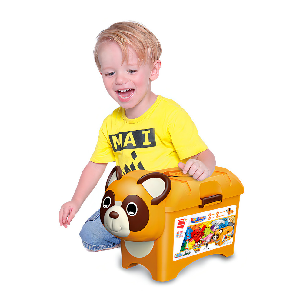 Úložný box se díky roztomilé zvířecí masce promění v zářivou ozdobu dětského pokoje. Je plný pestrobarevných stavebních kostek rozmanitých tvarů. Díky několika úchytkám a madlu je snadno přenosný, jeho víko lze i zajistit, aby se obsah při transportu nevysypal. Vysoce variabilní stavebnice Qman z pestrobarevných plastových kostiček lze kombinovat s podobnými stavebnicemi mnoha dalších významných výrobců. Vyrobeno z kvalitního, nezávadného a odolného ABS plastu.