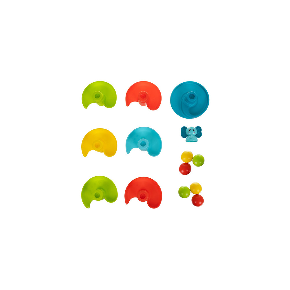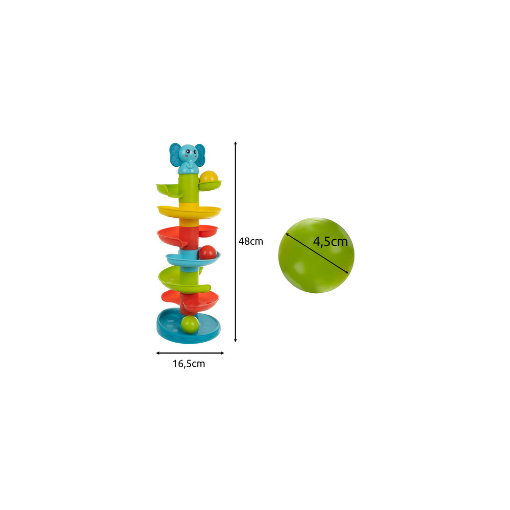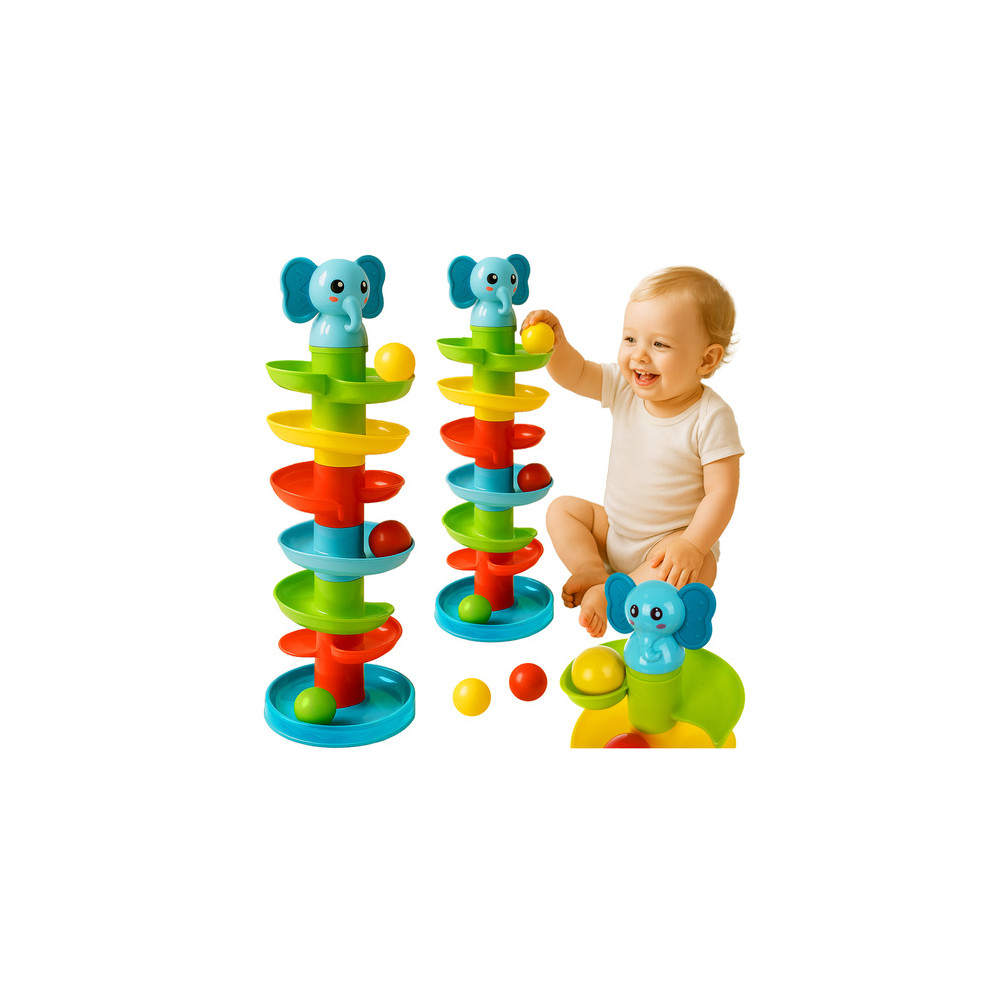 Dětská barevná kuličková dráha s motivem slona je interaktivní zábava pro nejmenší děti. Sledování barevných kuliček chrastících při kutálení se po spirálových drahách, přináší dítěti spoustu radosti. Dítě si procvičuje jemnou motoriku, koordinaci rukou a očí a logické myšlení tím, že skládá míčky na vrchol věže a sleduje jejich cestu dolů.