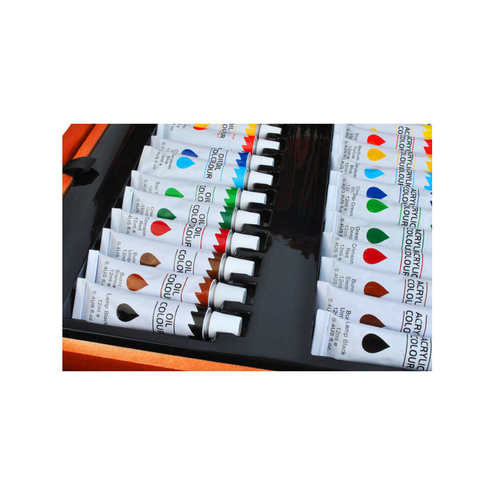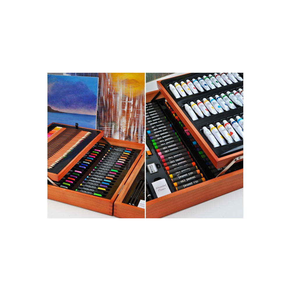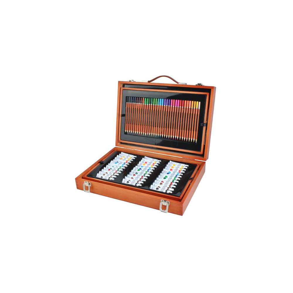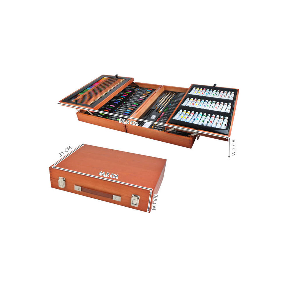 Malířská sada potřeb na malování ve velkém dřevěném kufříku. V kufříku najdete vše potřebné pro vytváření nejrůznějších maleb a kreseb, ať už suchou nebo morkou variantou. Jako jsou tempery, pastelky nebo voskovky apod.
