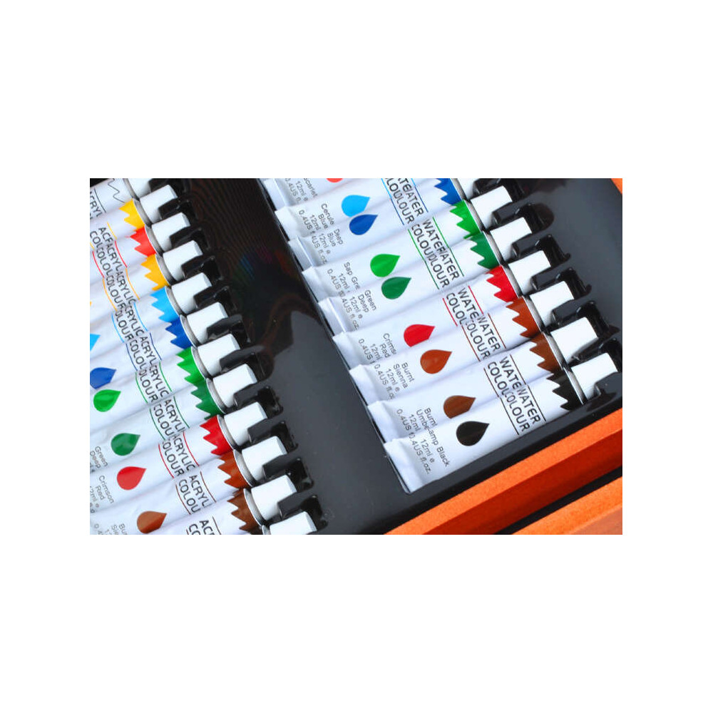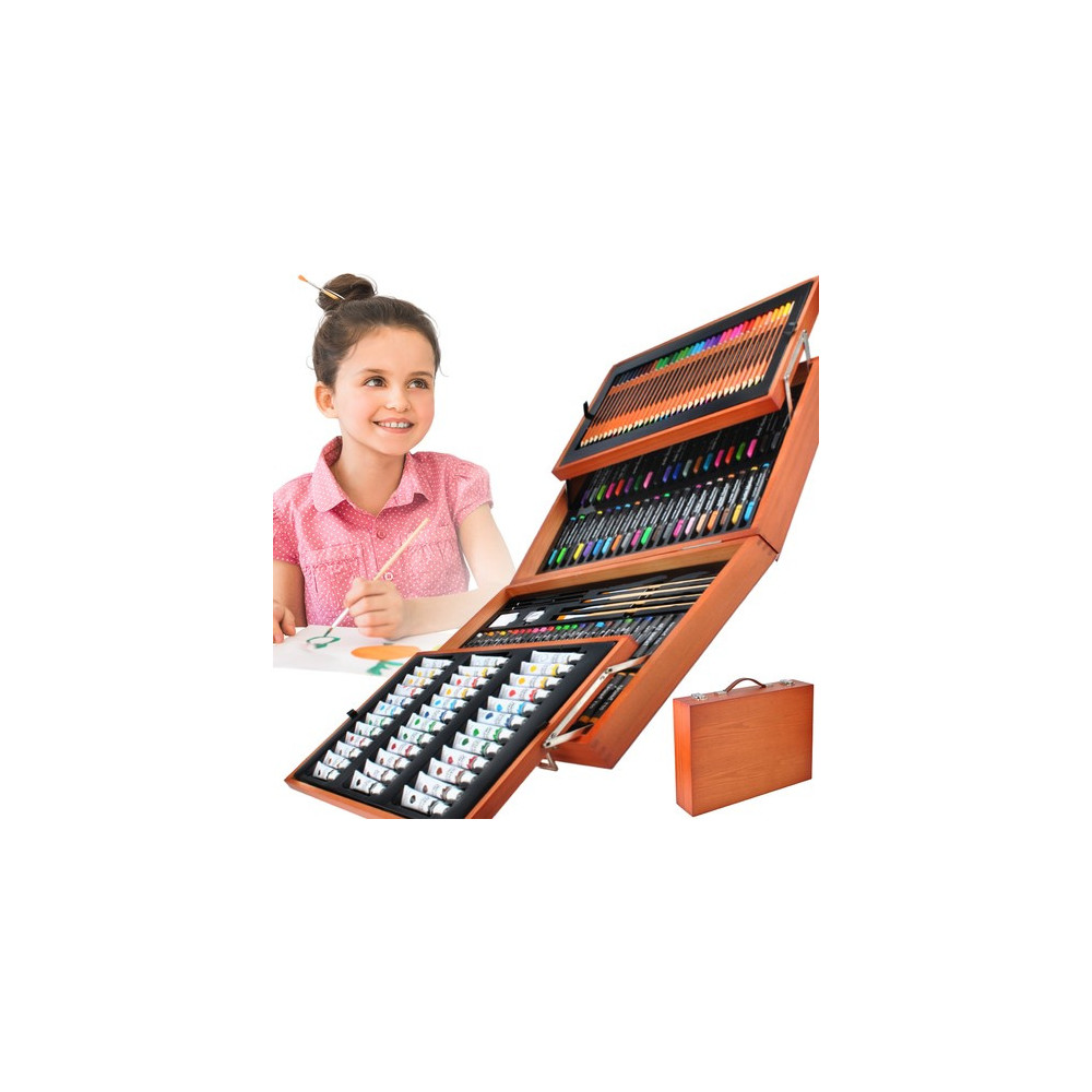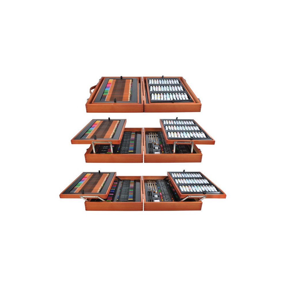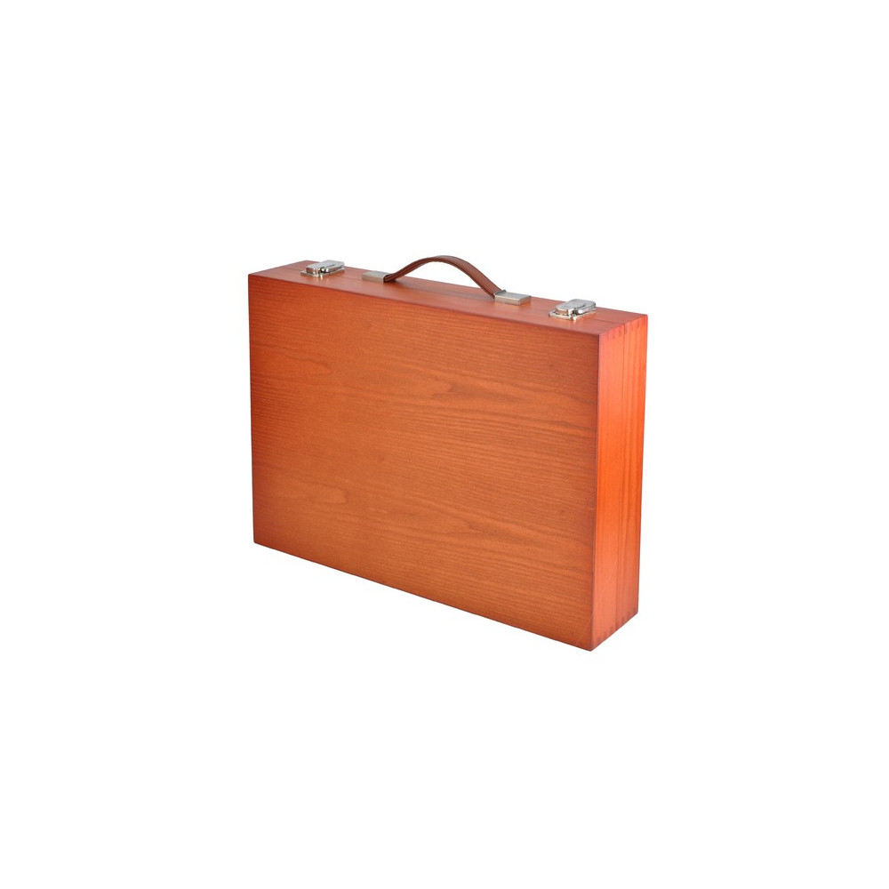 Malířská sada potřeb na malování ve velkém dřevěném kufříku. V kufříku najdete vše potřebné pro vytváření nejrůznějších maleb a kreseb, ať už suchou nebo morkou variantou. Jako jsou tempery, pastelky nebo voskovky apod.