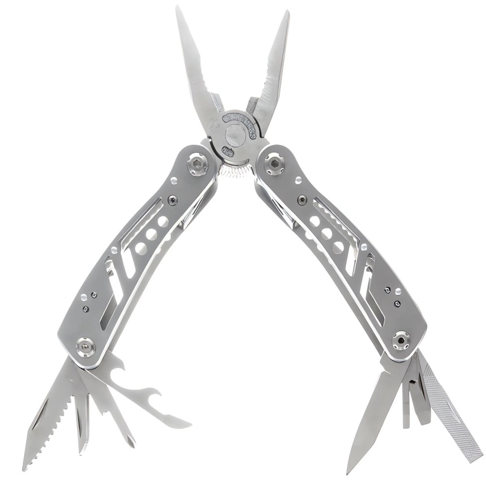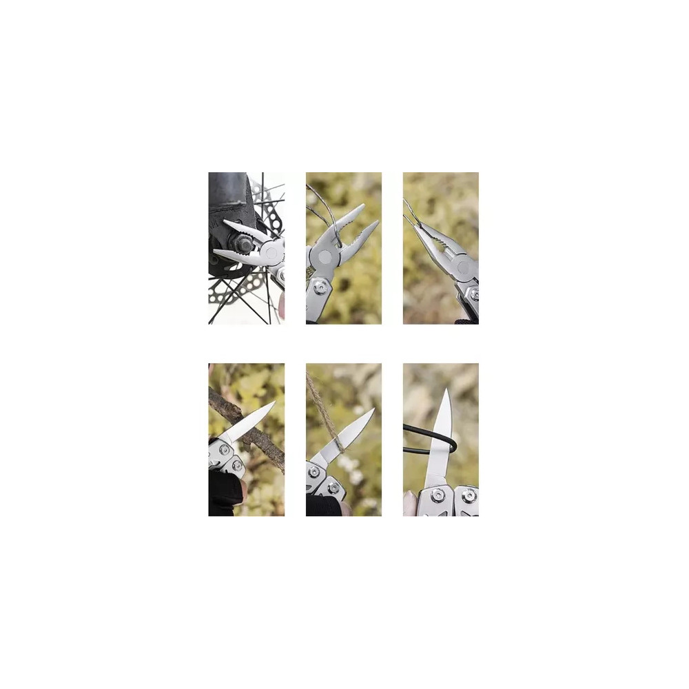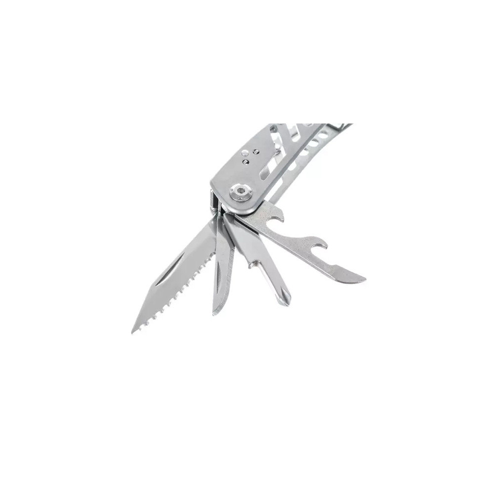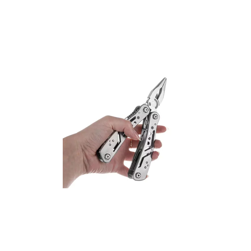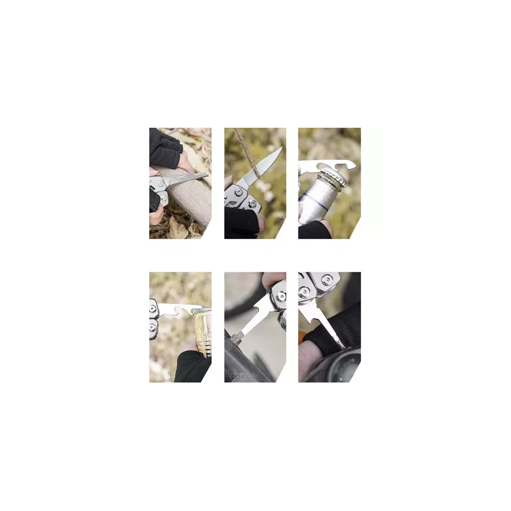 Multifunkční nářadí má až 13 různých vestavěných nástrojů, které můžete použít, abyste si poradili při přežití, rybaření, turistice, kempování, ve stanech, v práci nebo jednoduše při zahradničení. Multitool obsahuje nůž, pilový list, kleště, otvírák na láhve, otvírák na konzervy, šroubovák, kapesní nůž, kleště, řezák a mnoho dalšího. Nářadí je uloženo v praktickém obalu na suchý zip.