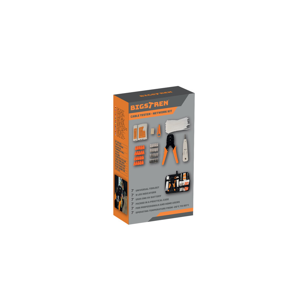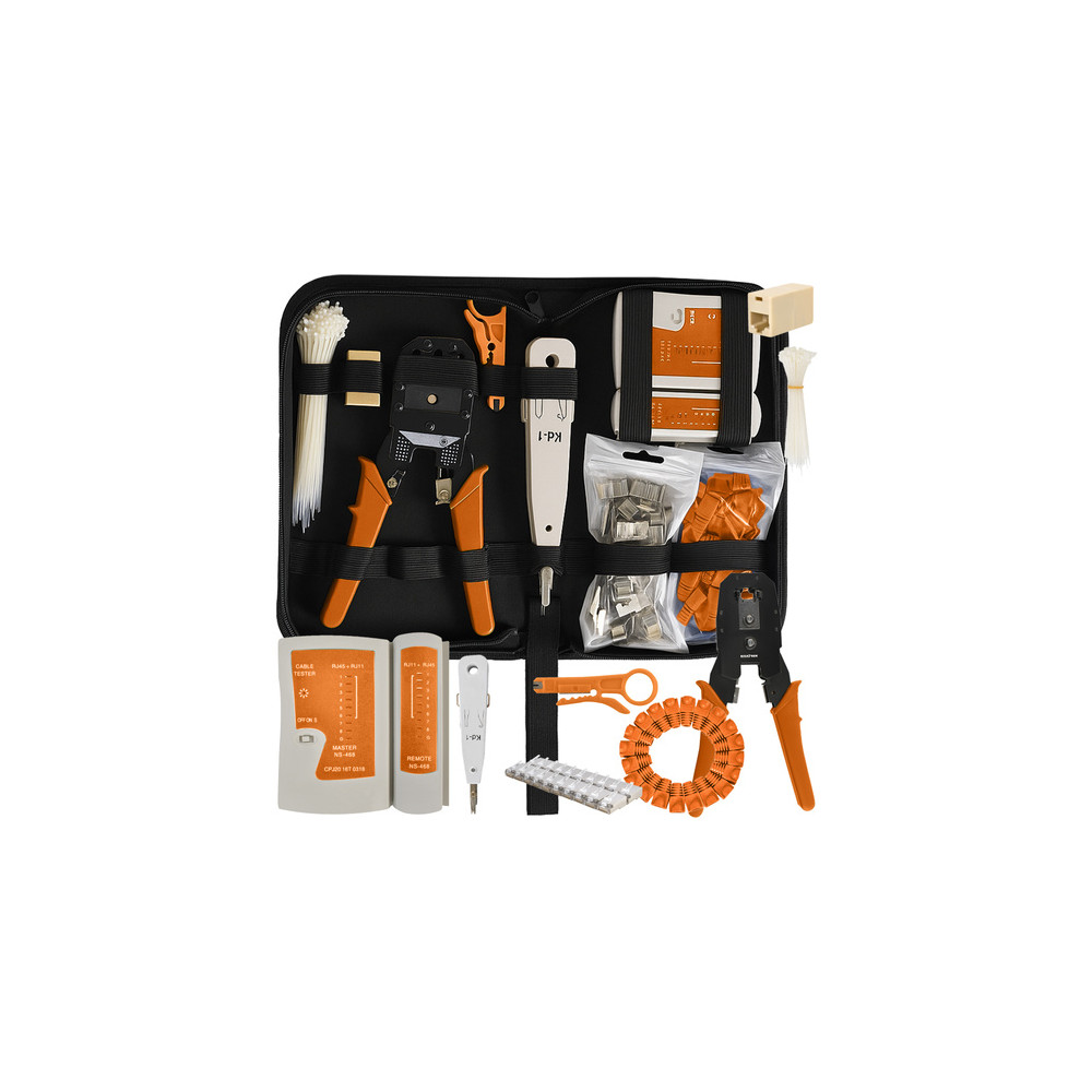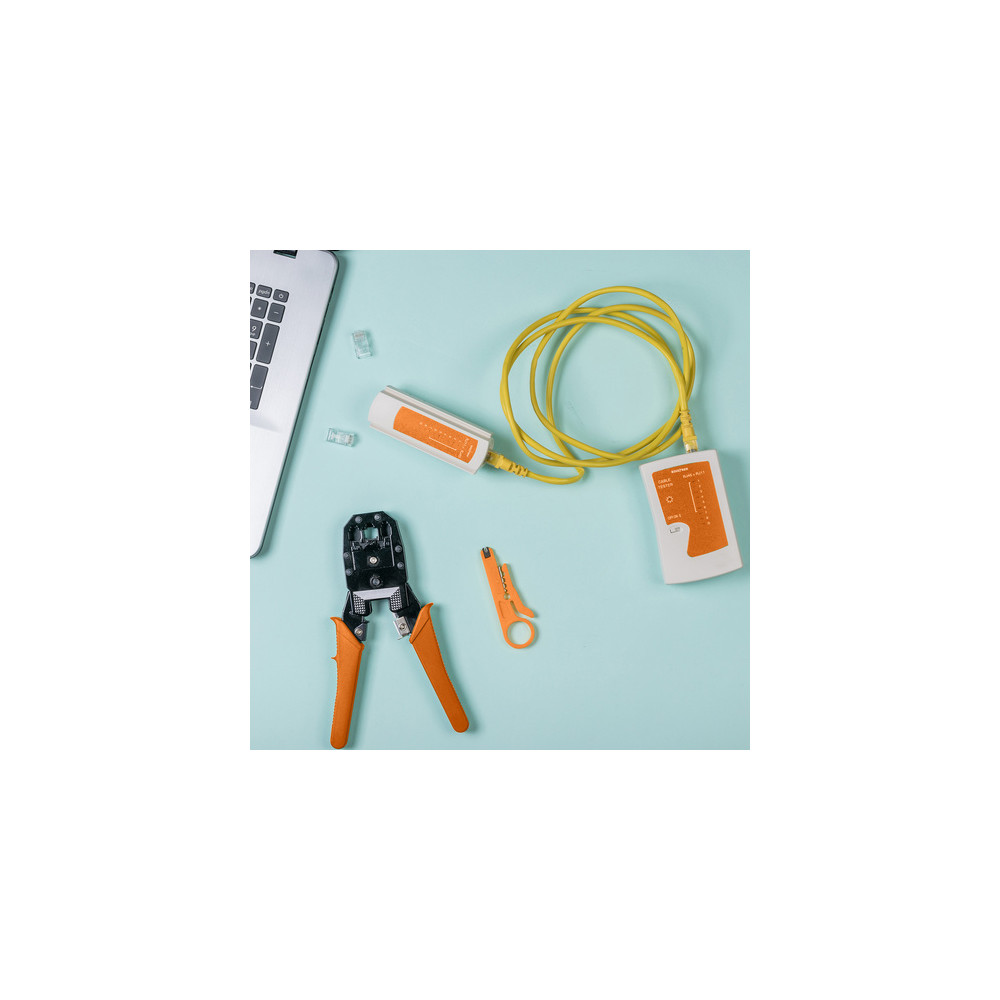 Sada nářadí pro instalaci sítí obsahuje kompletní sadu užitečných nástrojů jako např. krimpovací kleště, konektory RJ45 nebo krytky. Vše je zabalené v estetickém pouzdře, takže můžete ihned začít s instalací nebo opravou sítě. Tester se snadno používá, stačí zasunout zástrčky a zapnout zařízení.