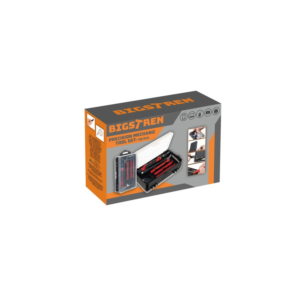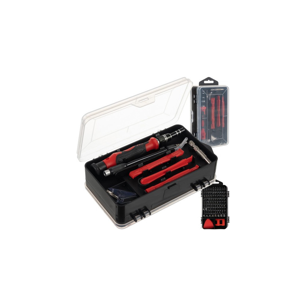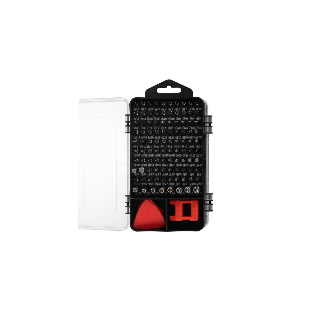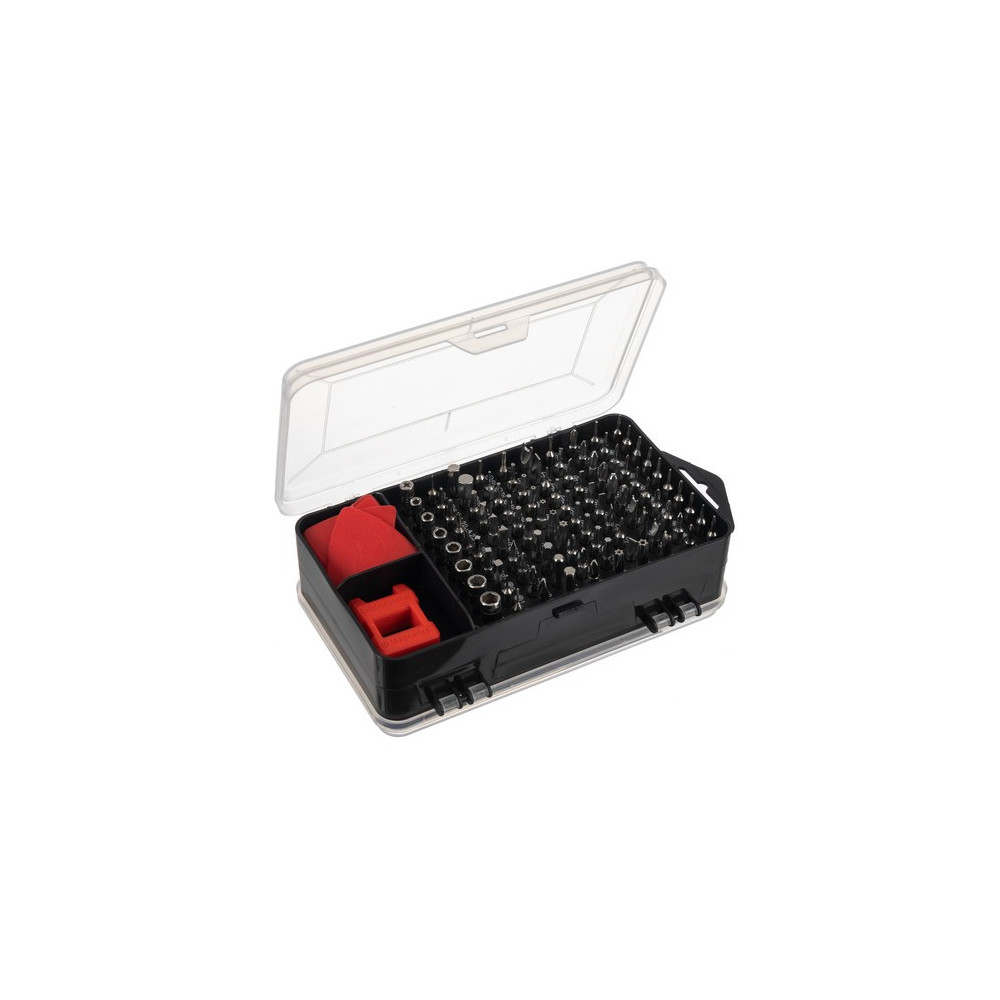 Sada specializovaných šroubováků se 110 prvky umístěnými v oboustranném pouzdře. Oprava moderních elektronických zařízení vyžaduje nejen dovednosti, ale také použití vhodného a přesného vybavení. Výrobci používají různé typy ochran, k jejichž otevření jsou potřeba další hroty, které se v základních sadách šroubováků těžko shánějí. Každý prvek má své místo, což umožňuje udržovat pořádek a efektivní organizaci pracoviště a tím i jeho rychlé a přesné provedení.