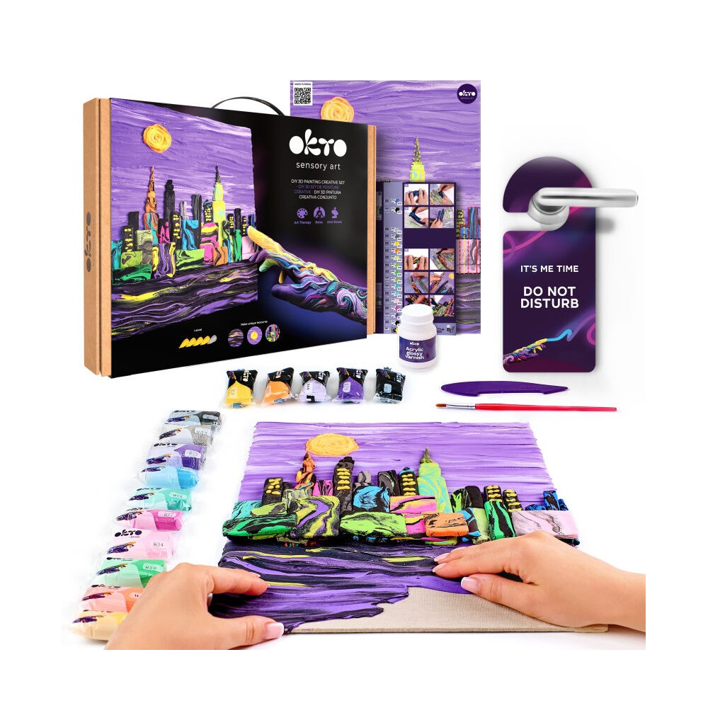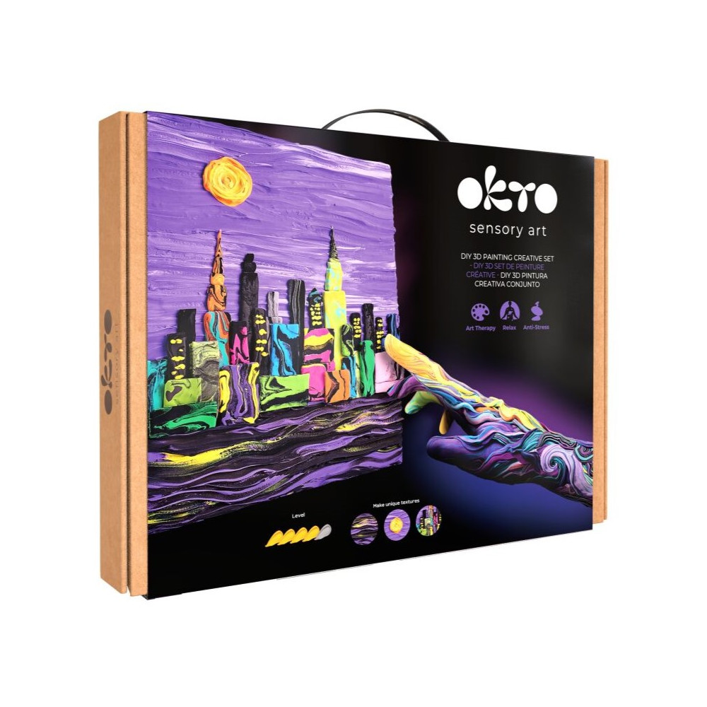 OKTO SENSORY ART výtvarná sada ”New York skyline” je kreativní sada, kde si pomocí modelovací hmoty vytvoříte svůj vlastní 3D umělecký obraz. Vše potřebné najdete v sadě. Součástí balení je i QR kód pod kterým najdete videonávod pro tvoření.