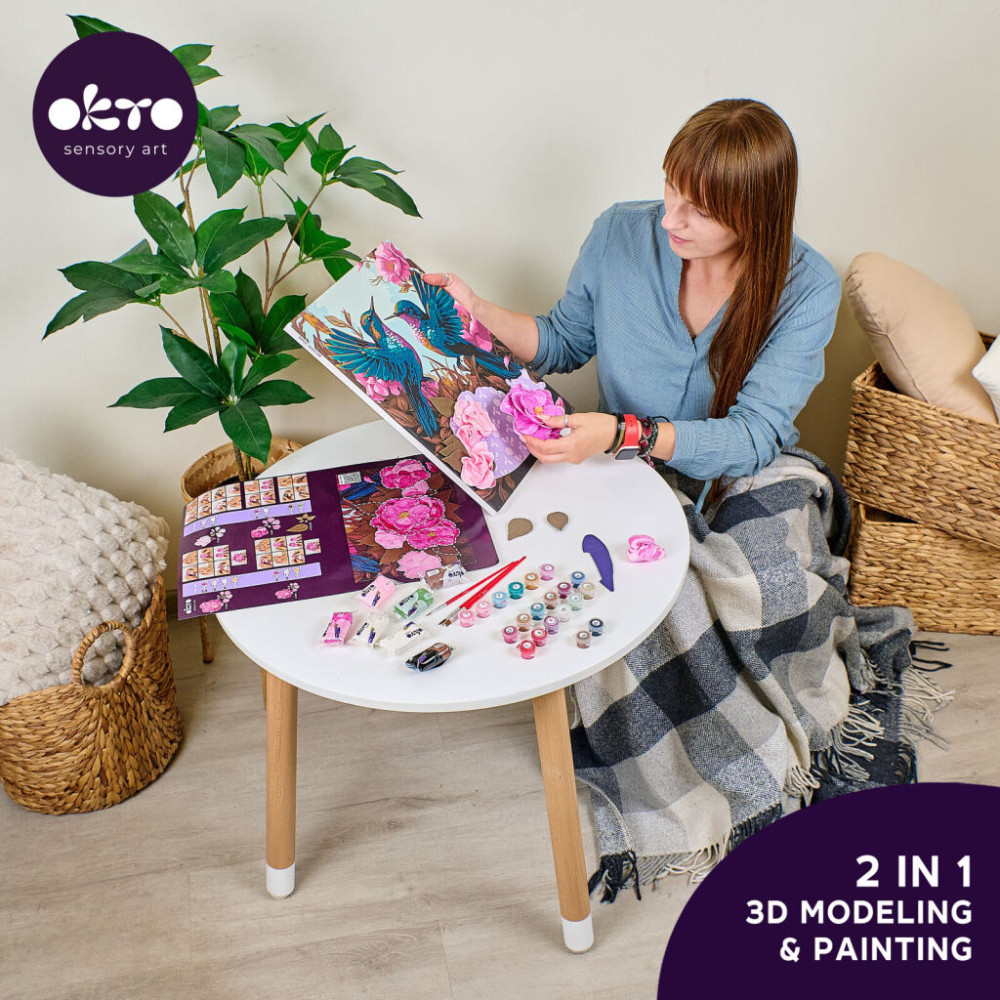 OKTO SENSORY ART výtvarná sada 3D je kreativní sada, kde si pomocí modelovací hmoty a barev vytvoříte svůj vlastní 3D umělecký obraz. Vše potřebné najdete v sadě. Část obrázku si vymalujete podle čísel a část vymodelujete.