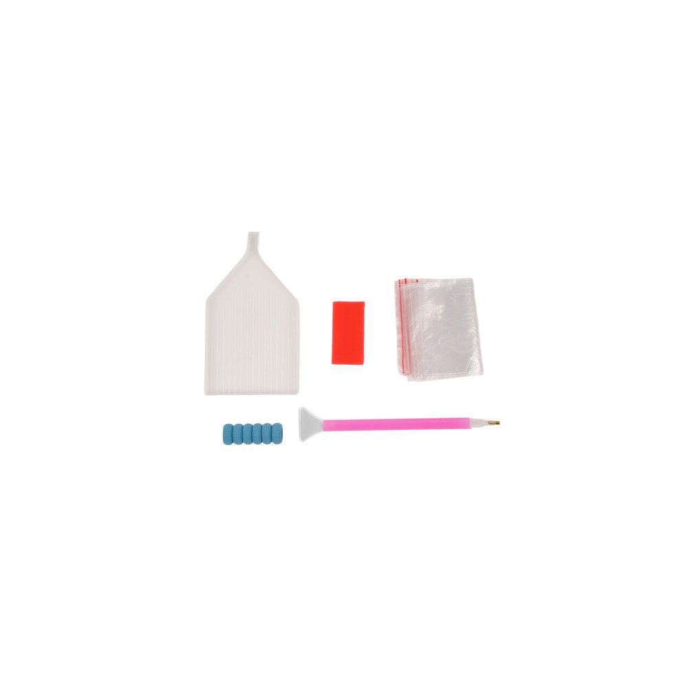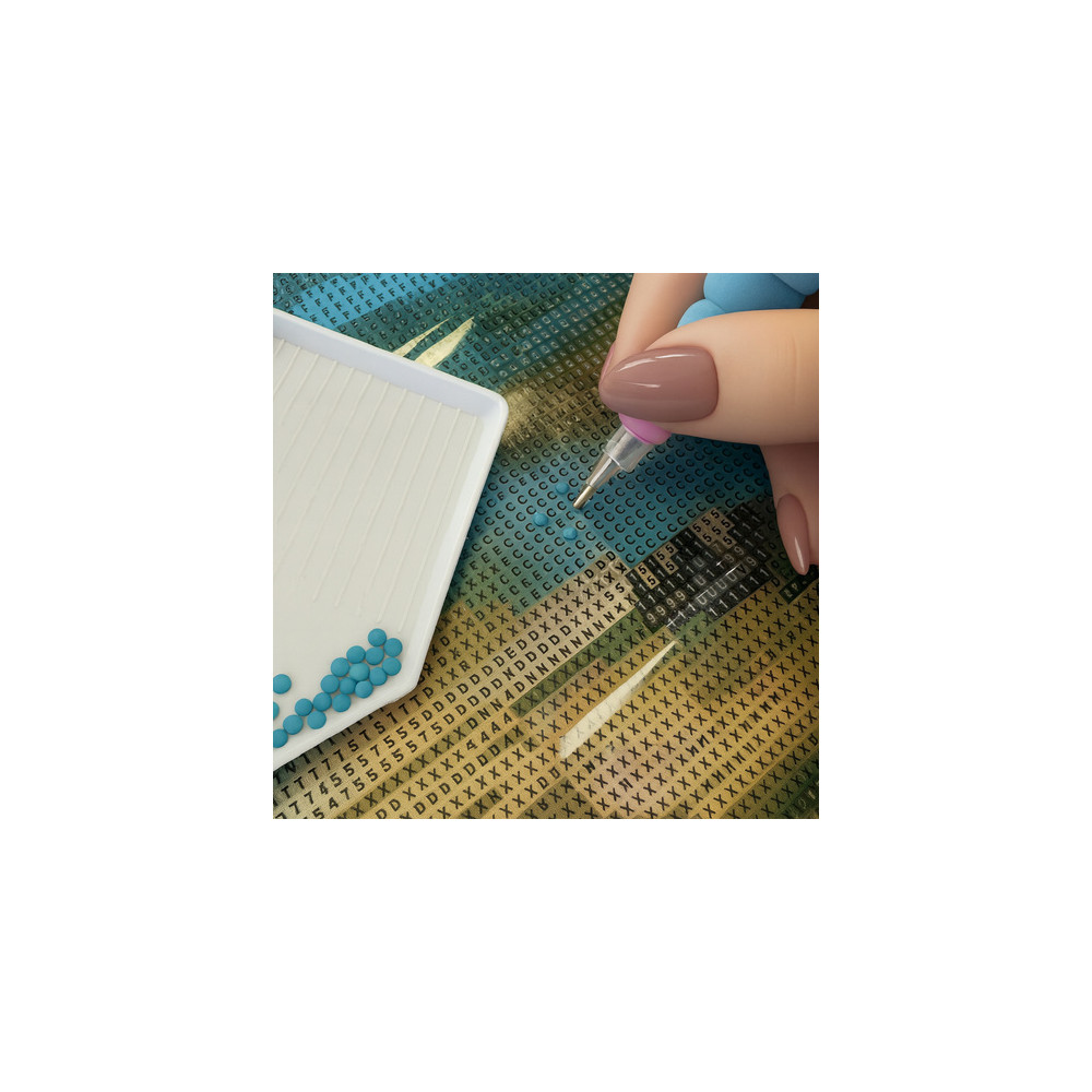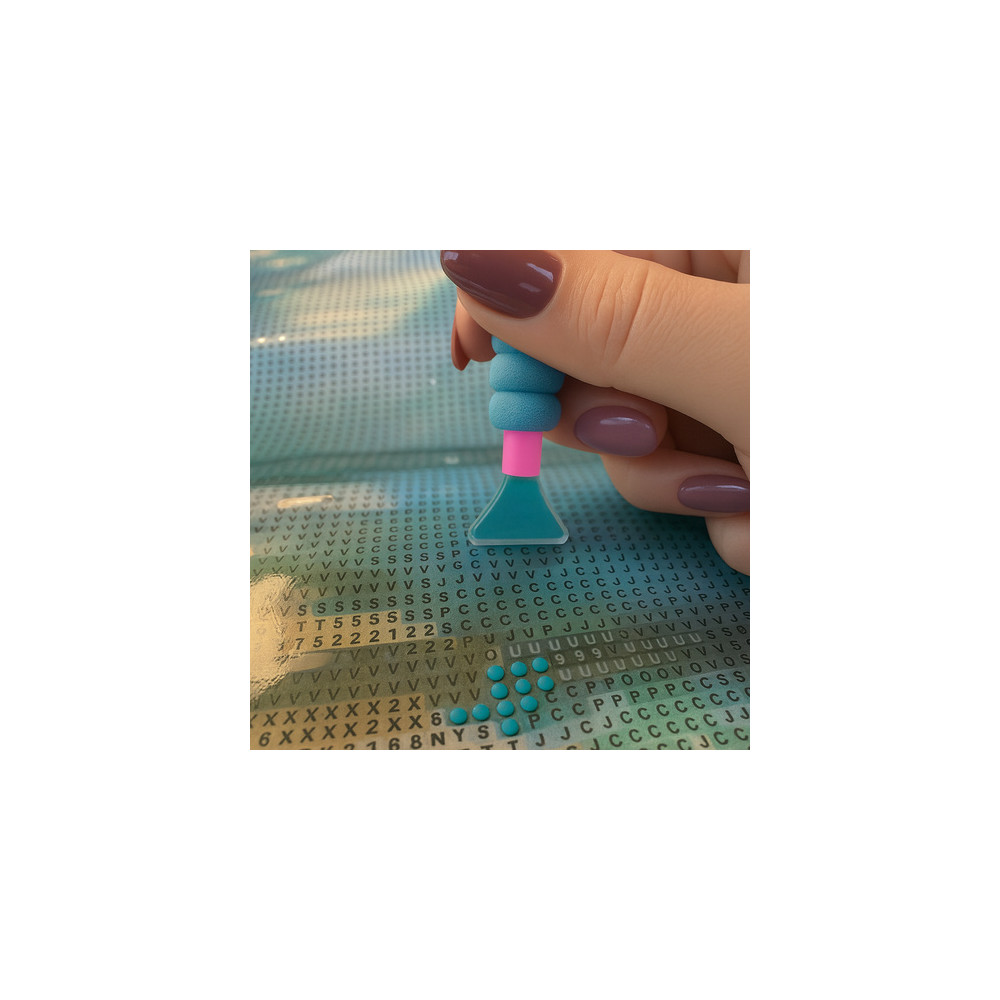Postup: Obrázek je zakrytý ochrannou folii, kterou sundávejte vždy postupně, tak jak budete aplikovat kamínky. Při sundání celé folie najednou hrozí, že se ztratí viskozita lepidla a kamínky nebudou držet. Plátno obsahuje označení, která jsou umístěna i na sáčcích s kamínky. Podle označení, víte kam který kamínek patří. Nejprve si do hrotu tužky naberete vosk, díky kterému se kamínky snadno přichytí na pero. Kamínky perem aplikujete na obrázek.