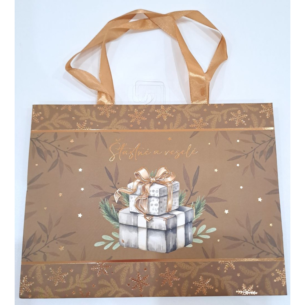 Krásná darková taška s vánoční motivem středního rozměru se saténovou stužkou a zlatou leskou ražbou.