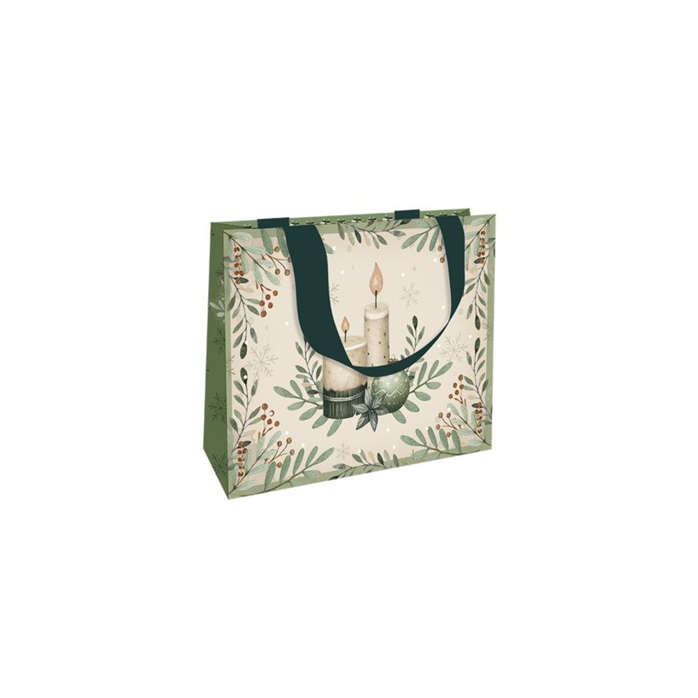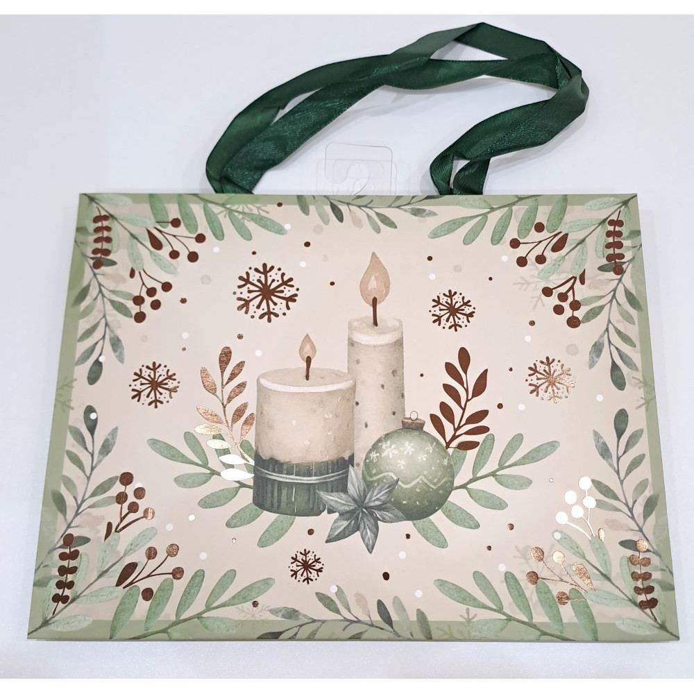 Krásná darková taška s vánoční motivem středního rozměru se saténovou stužkou a zlatou leskou ražbou.