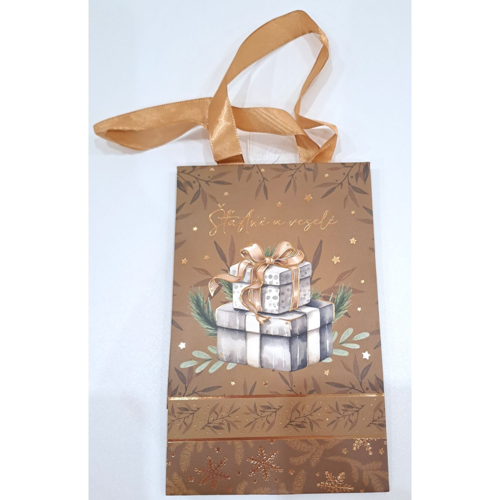 Krásná darková taška s vánoční motivem malého rozměru se saténovou stužkou a zlatou leskou ražbou.