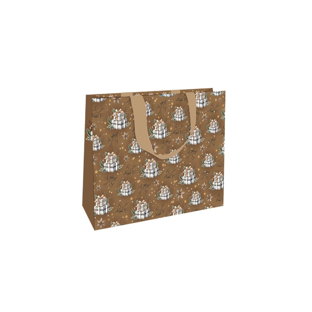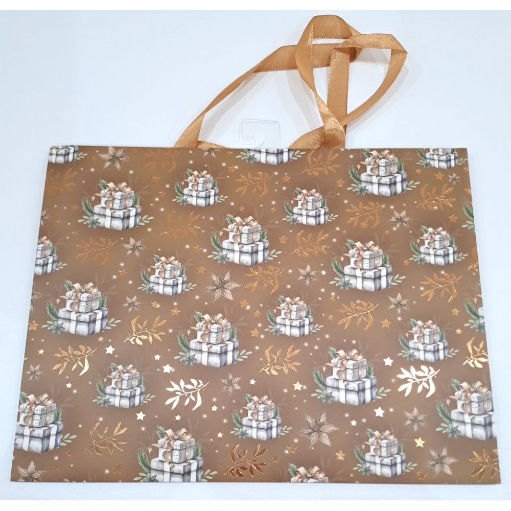 Krásná darková taška s vánoční motivem velkého rozměru se saténovou stužkou a zlatou leskou ražbou.