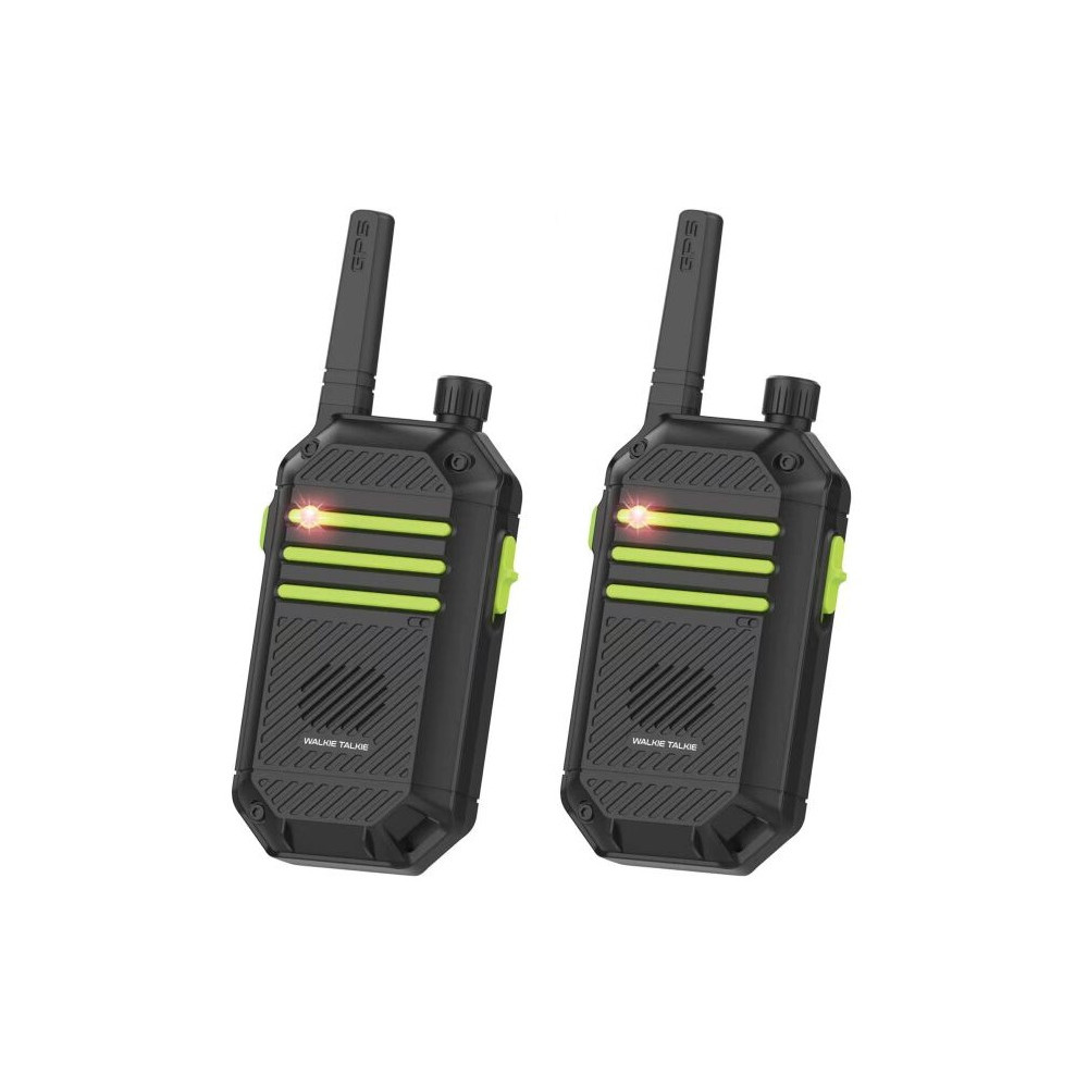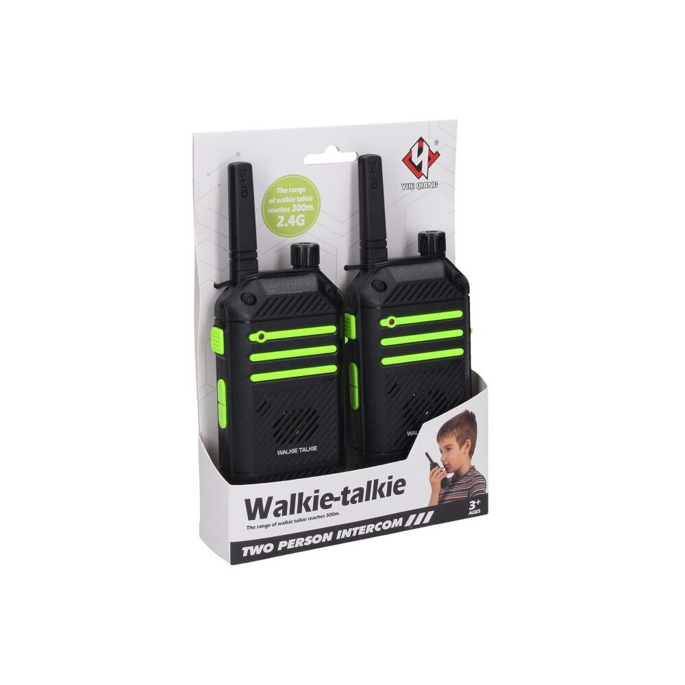 Sada dětských vysílaček s dosahem až 300 metrů. Tlačítko pro mluvení je umístěno na levé straně vysílačky. Přepínač ON/OFF je na pravé straně.