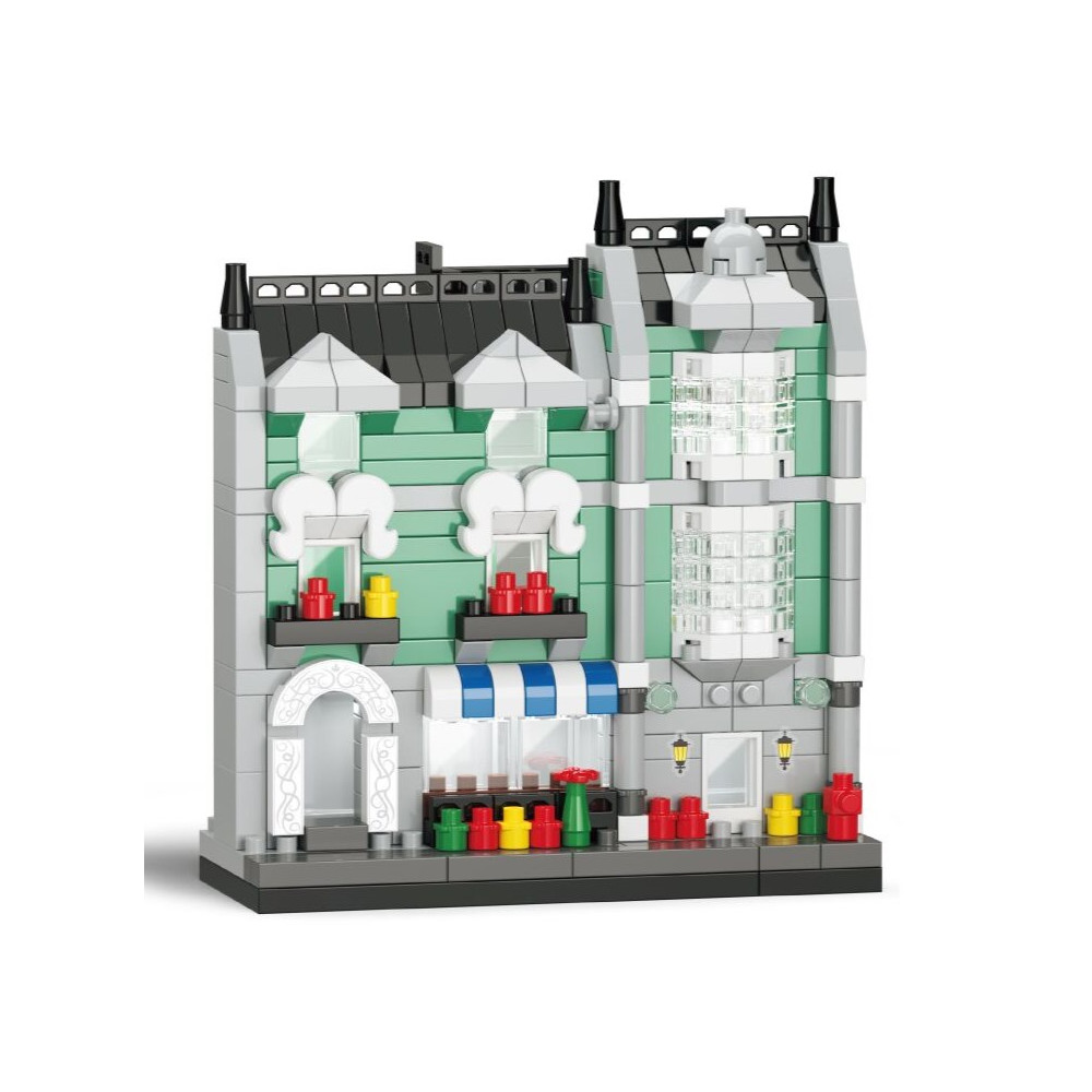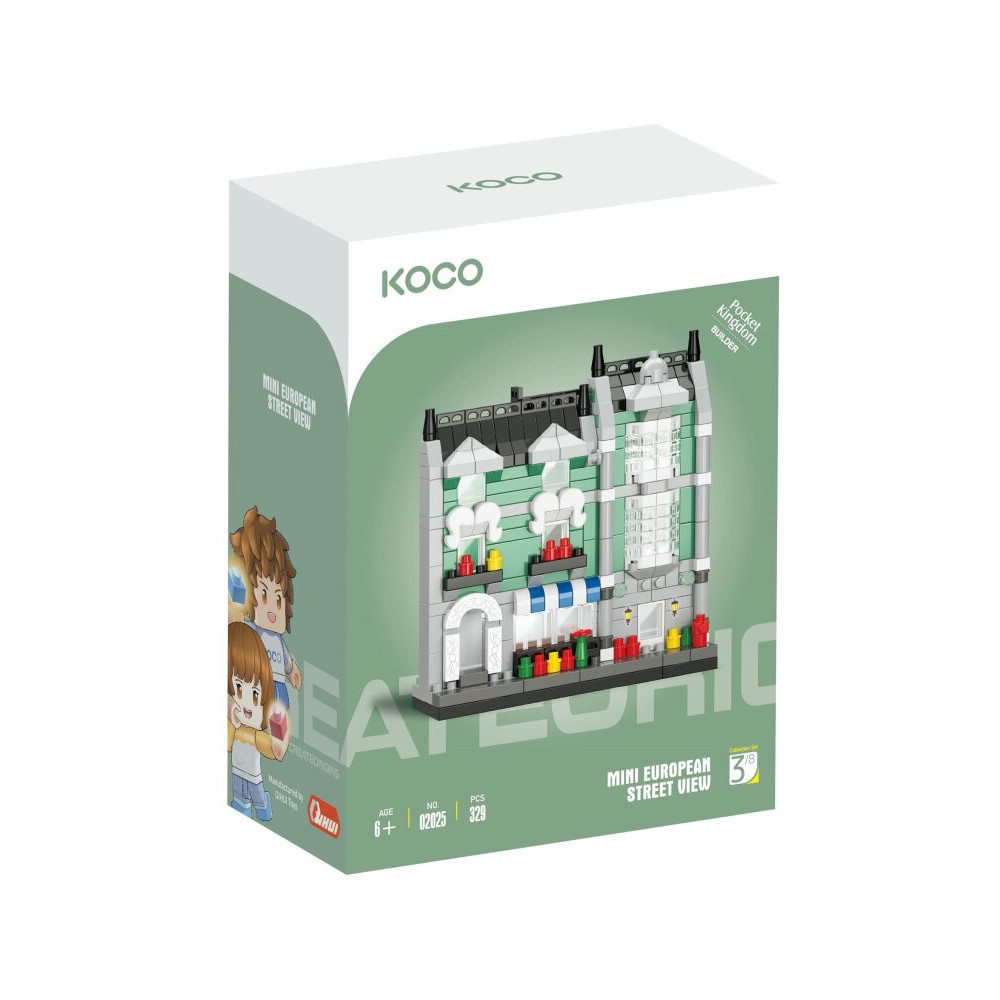 KOCO Stavebnice mini, ze které si sami postavíte pohled do ulice na obchod s potravinami. Obrázkový návod na sestavení součástí.