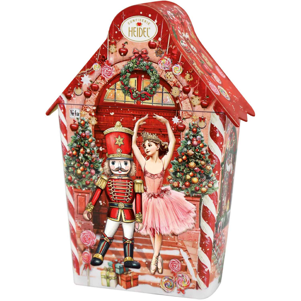 Krásná dárková plechová krabička s motivem Louskáčka obsahuje 2 mini tabulkové čokoládky, 2 pralinkové bonbóny z mléčné čokolády a 3 bonbóny s krémem.