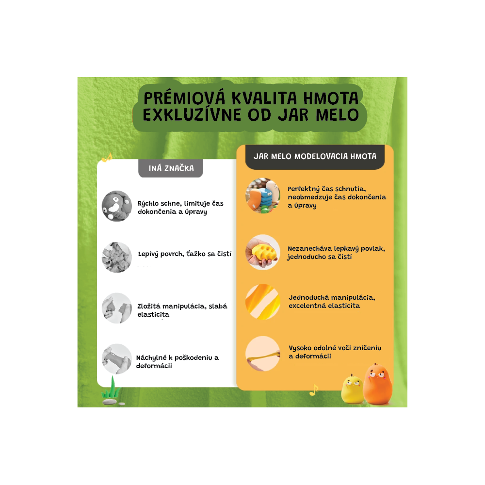 Lehká jako obláček, hravá jako dětská fantazie. Tato sada od Jarmelo obsahuje 24 nádherných barev ultra lehké plastelíny, která je jemná, elastická a ideální pro chytré ručičky. Děti s ní mohou modelovat, míchat barvy, tvarovat zvířátka, postavičky či různé předměty. Necháte-li však modelovací hmotu na vzduchu, ztvrdne a nelze s ní dále pracovat. Tímto způsobem však děti umí vytvořit z měkkých výtvorů reálně tvrdé postavičky nebo jiná díla, se kterými si mohou potom hrát.