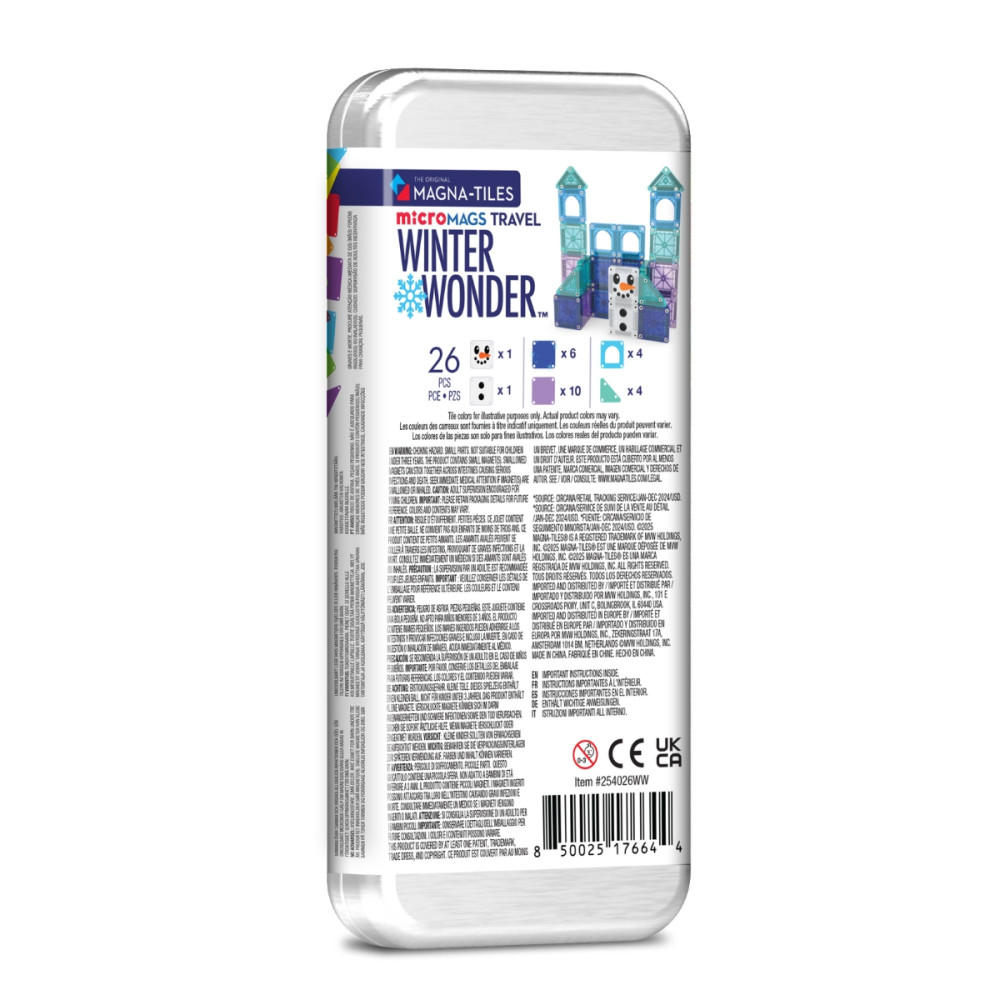 Cestovní sada Magna-Tiles pro každý výlet. Magnetická stavebnice microMAGS Winter Wonderland Travel Set je ideální společník na cesty. Přináší praktičnost a zábavu v jednom kompaktním balení. Tento set obsahuje 26 magnetických dílků, kde všechny díly jsou o 75 % menší než tradiční MAGNA-TILES, což umožňuje ještě detailnější stavby malých stavitelů. Kovový plechový obal poskytuje pohodlné skladování, díky kterému je tento set dokonalým společníkem na rodinné výlety - vejde se do batohu, kabelky nebo cestovní tašky, takže děti mohou mít své oblíbené stavební díly vždy s sebou.