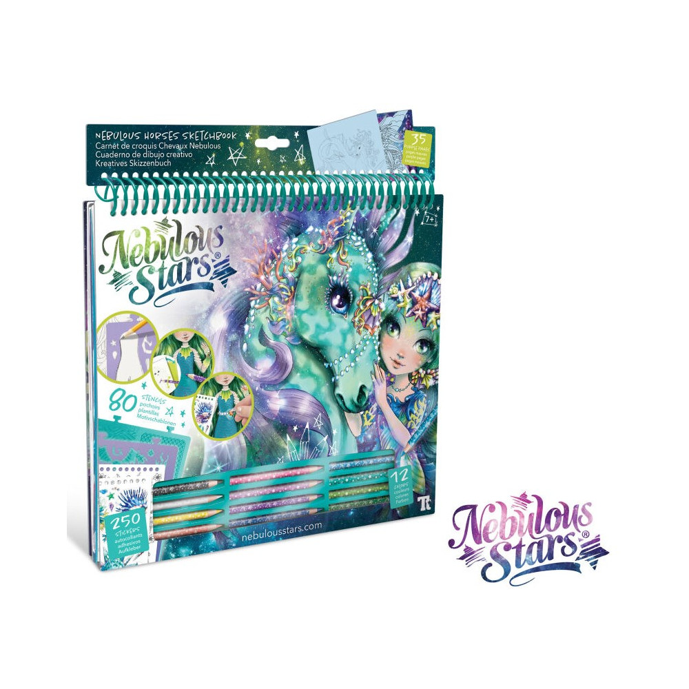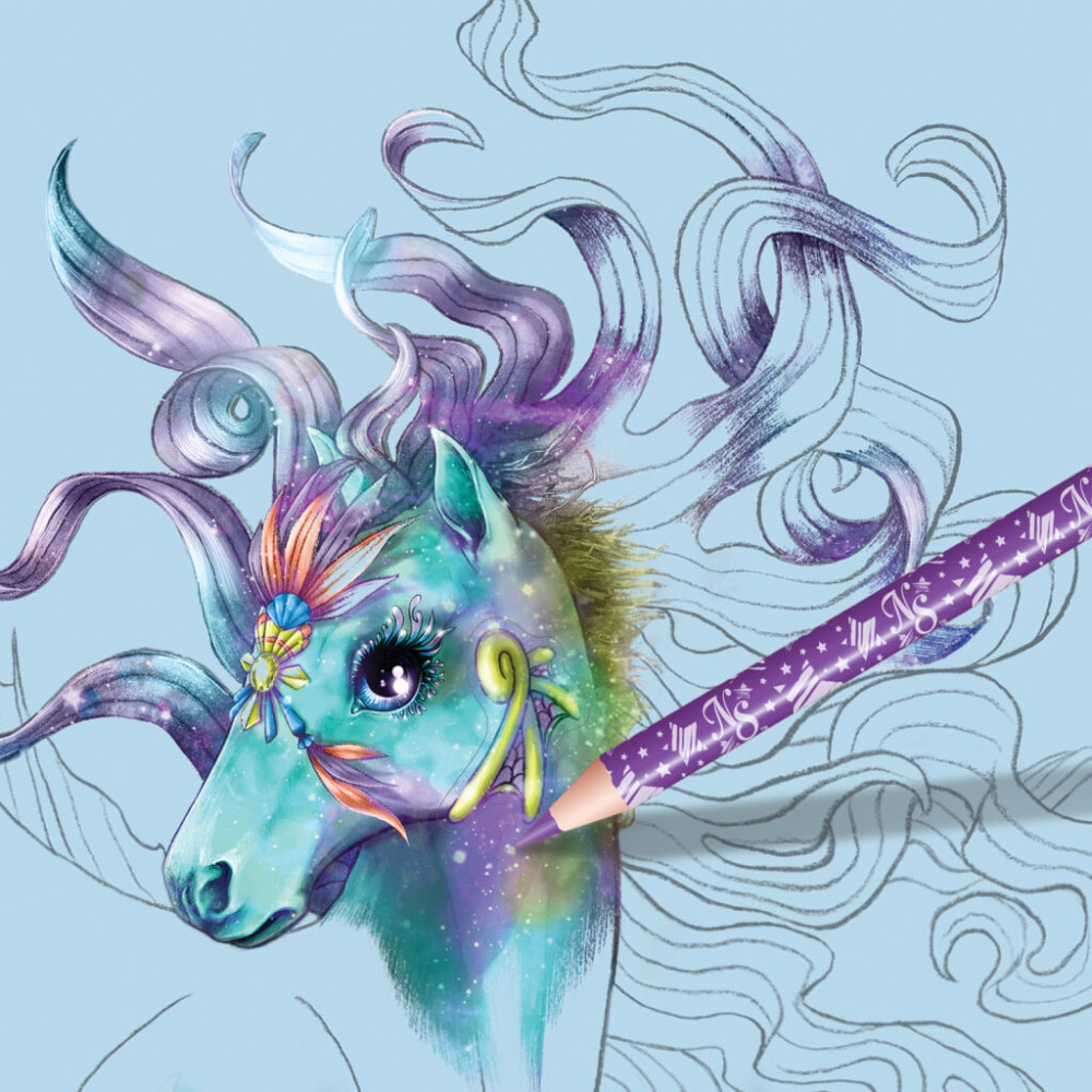 Vytvářejte magické a úžasné kresby fantasy koní, kteří budou jako stvořeni ke skotačení mezi hvězdami. Využijte množství různých nálepek, šablon a technik, které vám pomohou vytvořit koně vašich snů.