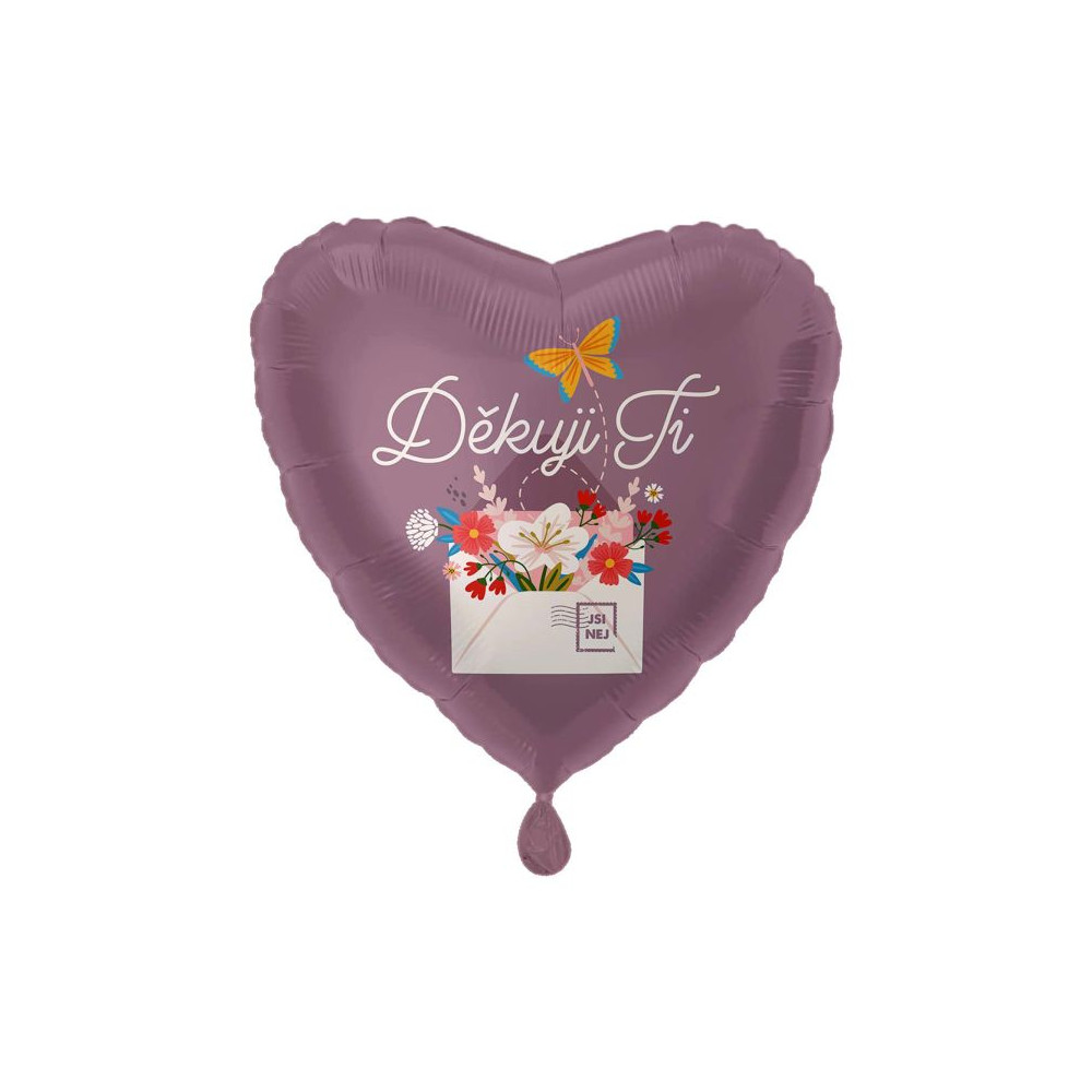 Fóliový balónek ve tvaru srdce s děkovným potiskem je krásný a originální způsob, jak vyjádřit vděčnost. Tento srdíčkový balónek má fialovou barvu, potisk obálky s květinami a nápis "Děkuju Ti".