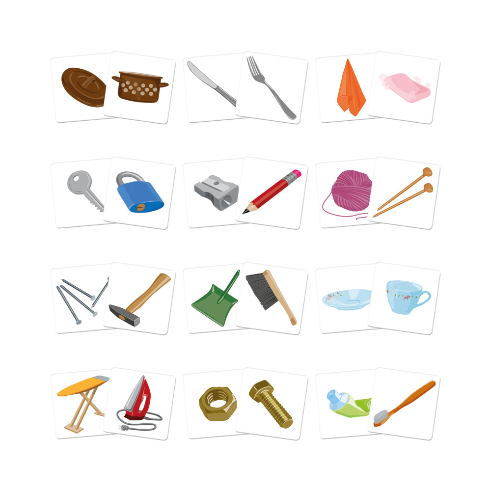 Klasická paměťová, kde se však hledají páry k sobě patřících předmětů. Velké kartičky ze silného kartonu vhodné pro malé děti i seniory.
