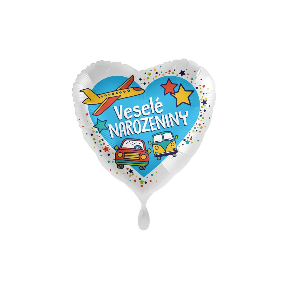 Srdcový fóliový balónek s dopravním motivem a nápisem „Veselé narozeniny“ je ideální dekorací na tematickou narozeninovou oslavu.