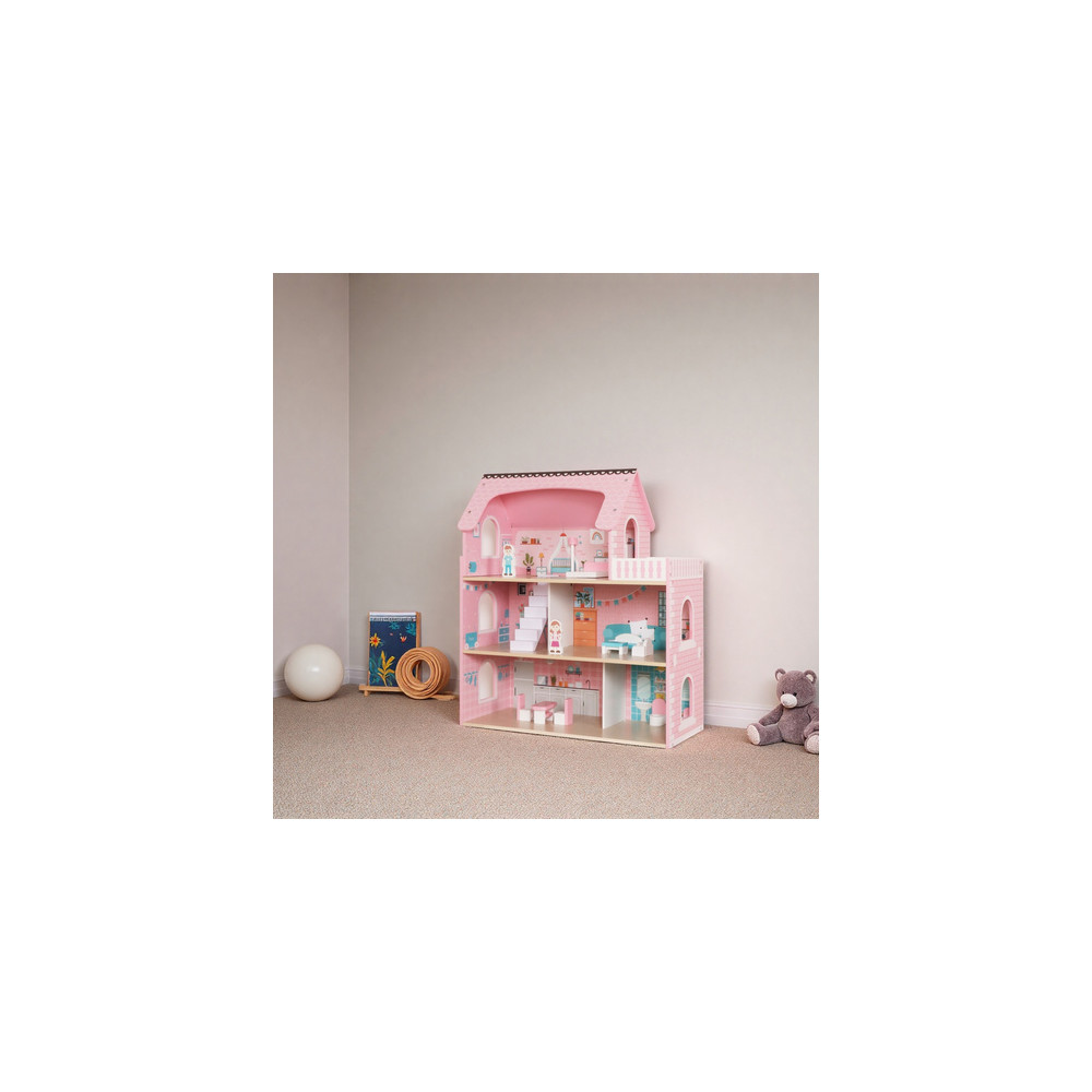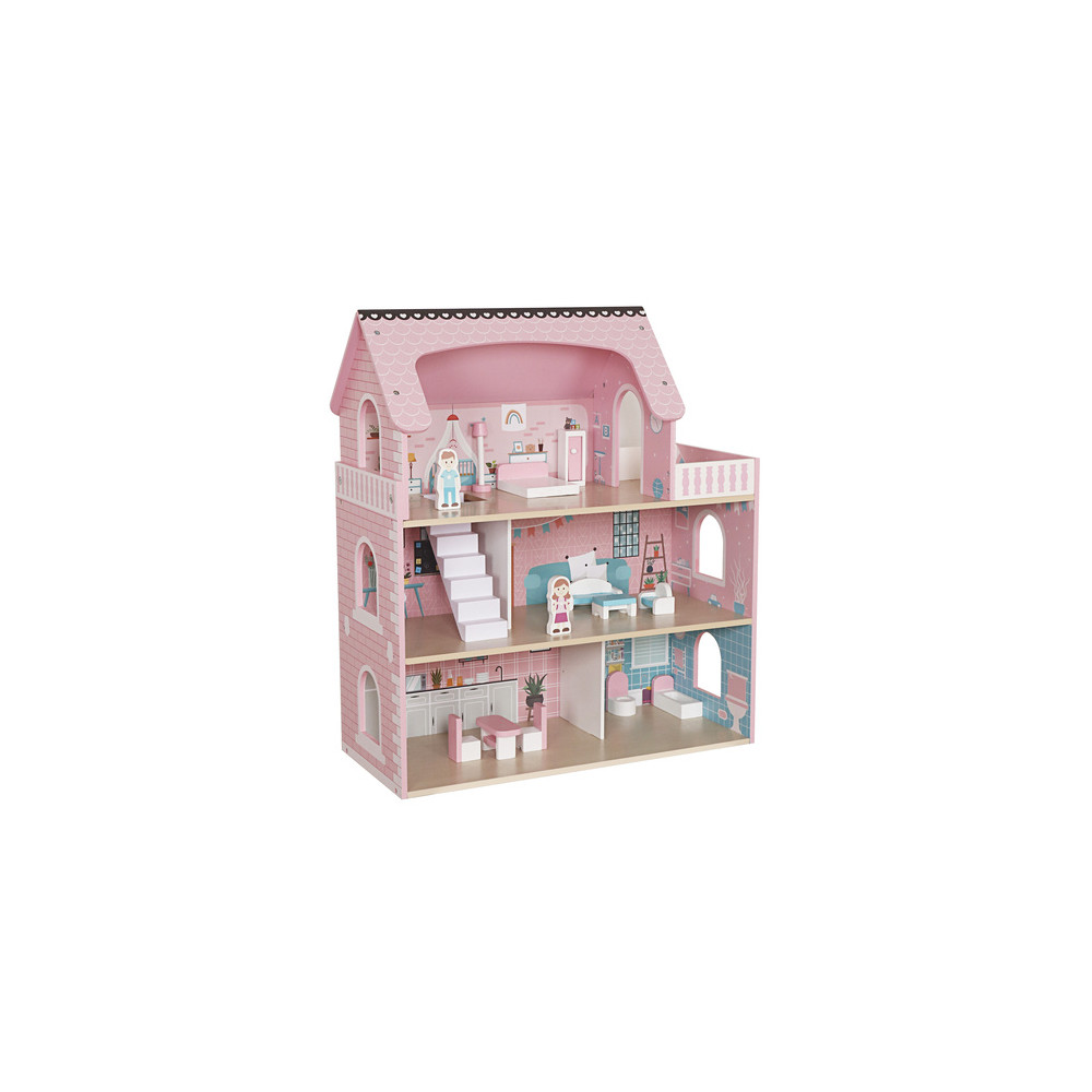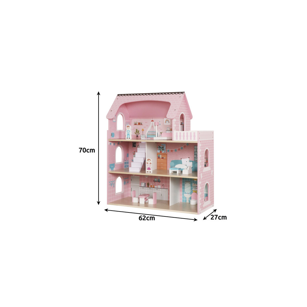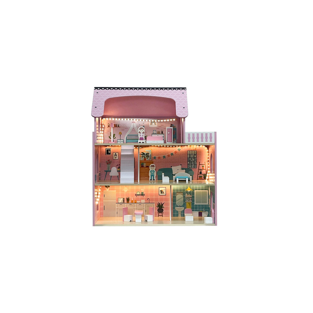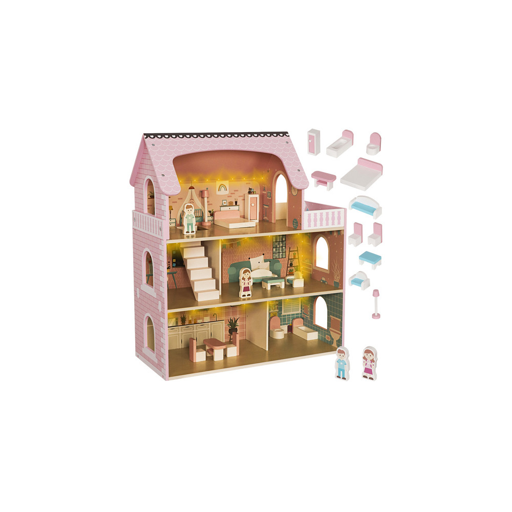 Velký dřevěný domeček pro panenky včetně nábytku, který má 3 poschodí a můžete si i rozsvítit světýlko při večerním hraní. Domeček je vyrobený ze dřeva v krásným dívčích barvách.