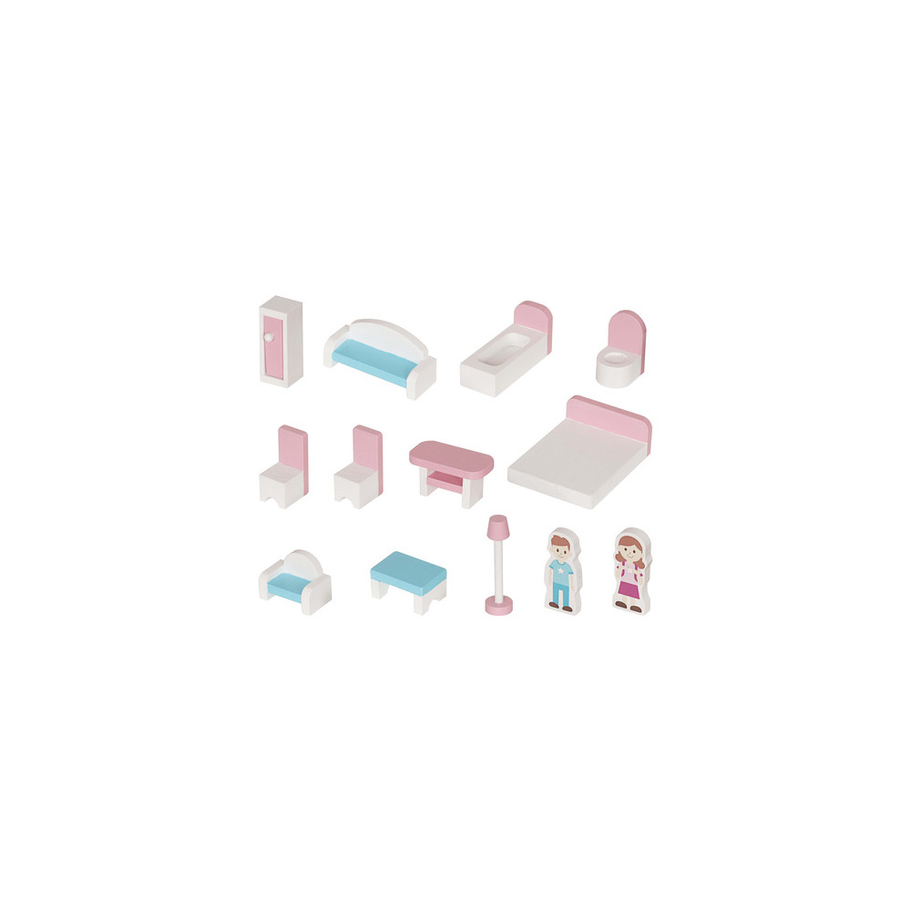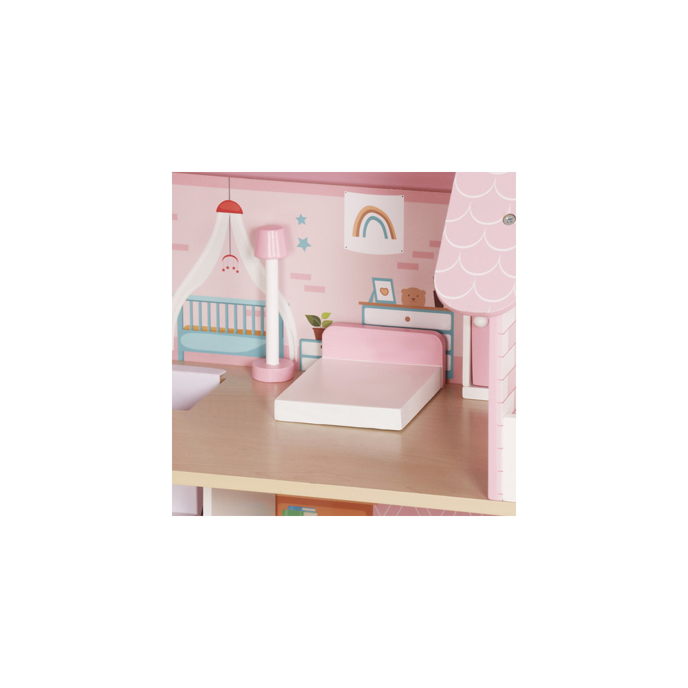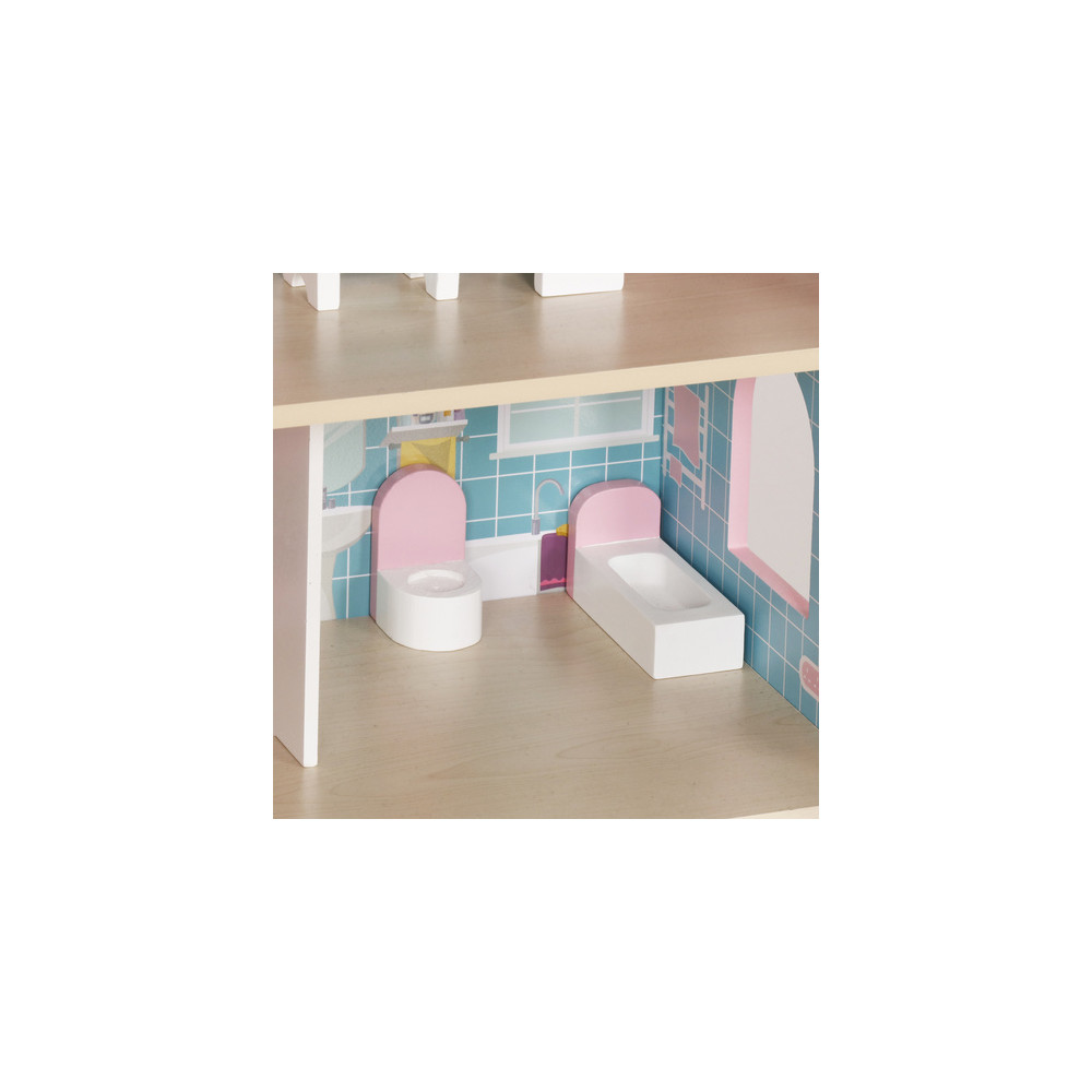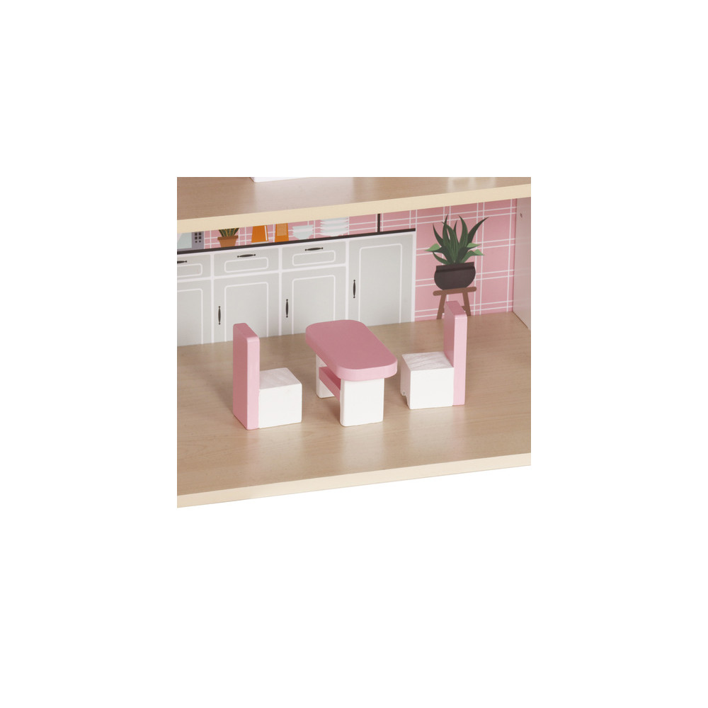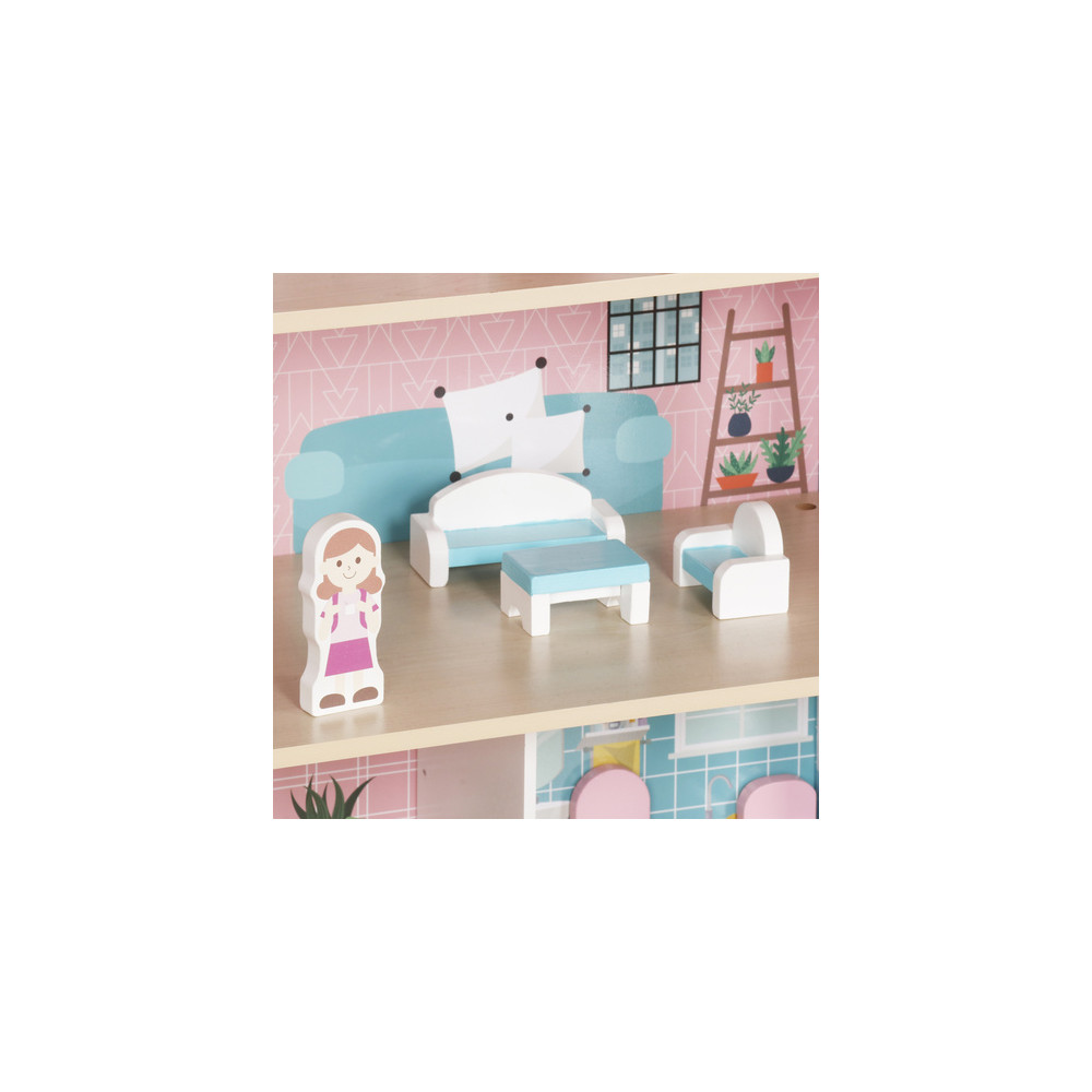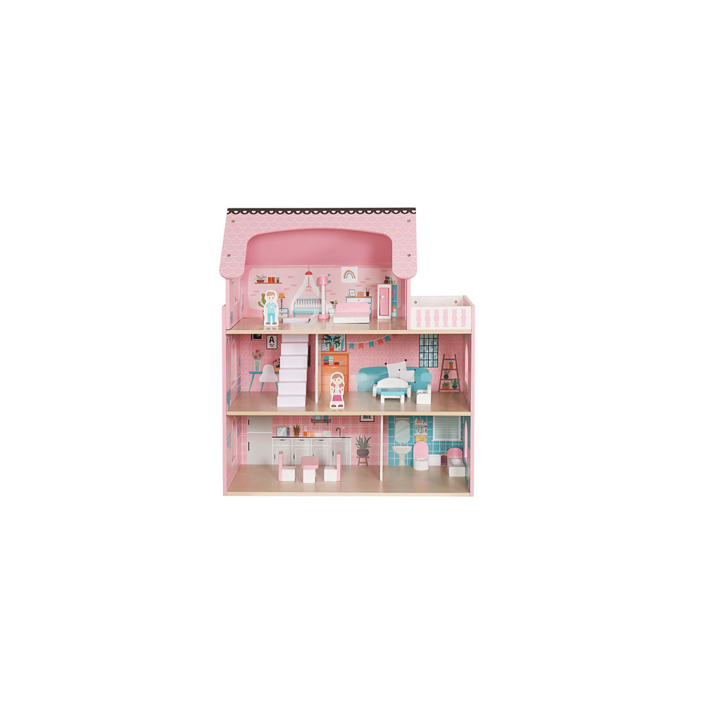 Velký dřevěný domeček pro panenky včetně nábytku, který má 3 poschodí a můžete si i rozsvítit světýlko při večerním hraní. Domeček je vyrobený ze dřeva v krásným dívčích barvách.