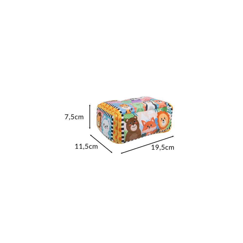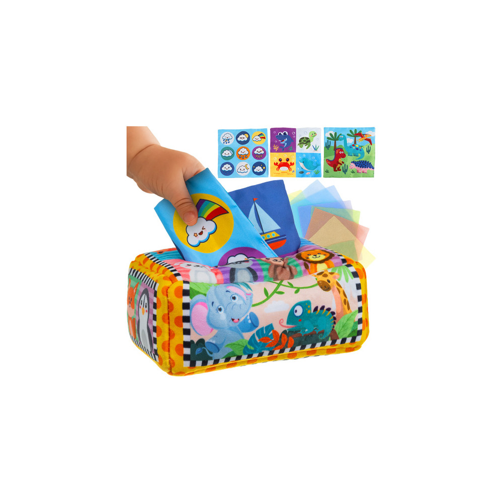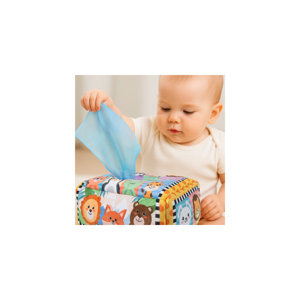 Senzorický box s plyšovými kapesníky pro podporu každodenního vývoje dítěte. Pomáhá rozvíjet manuální dovednosti, koordinaci ruka-oko a také učí rozpoznávat barvy, věci a zvířátka.