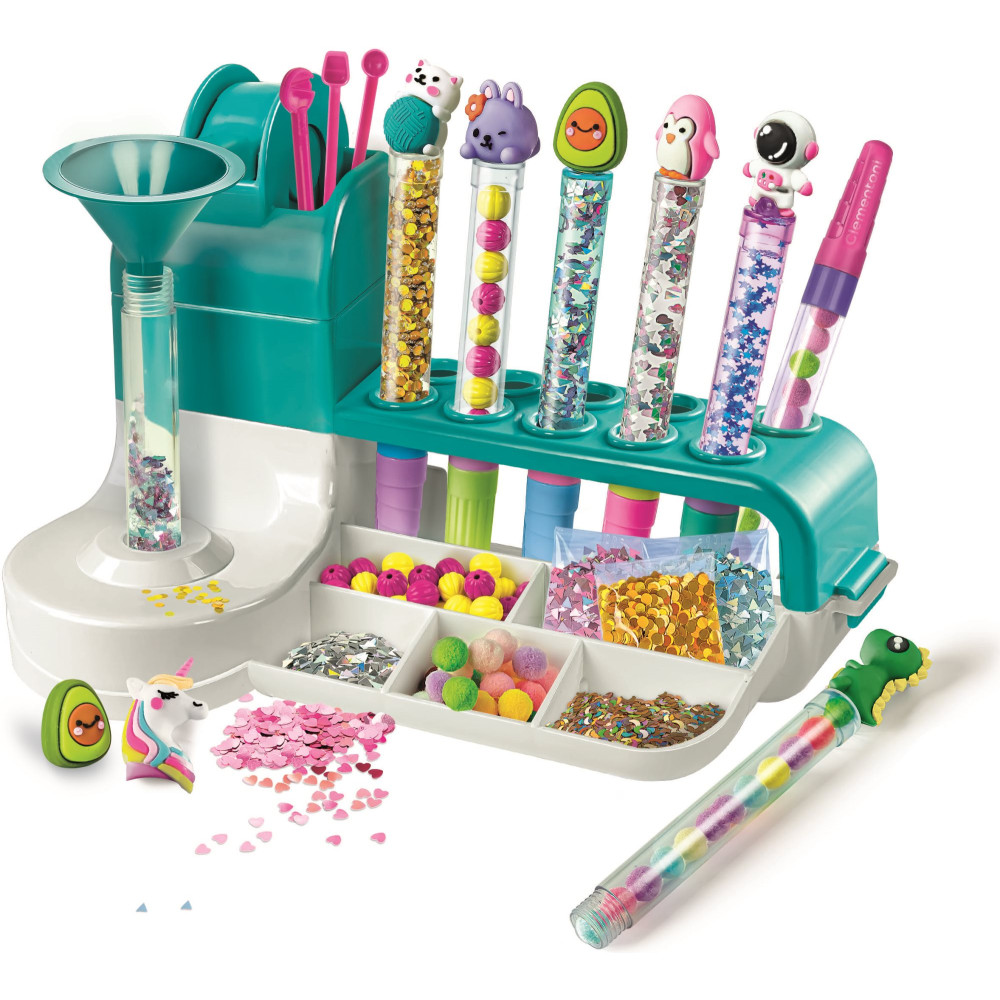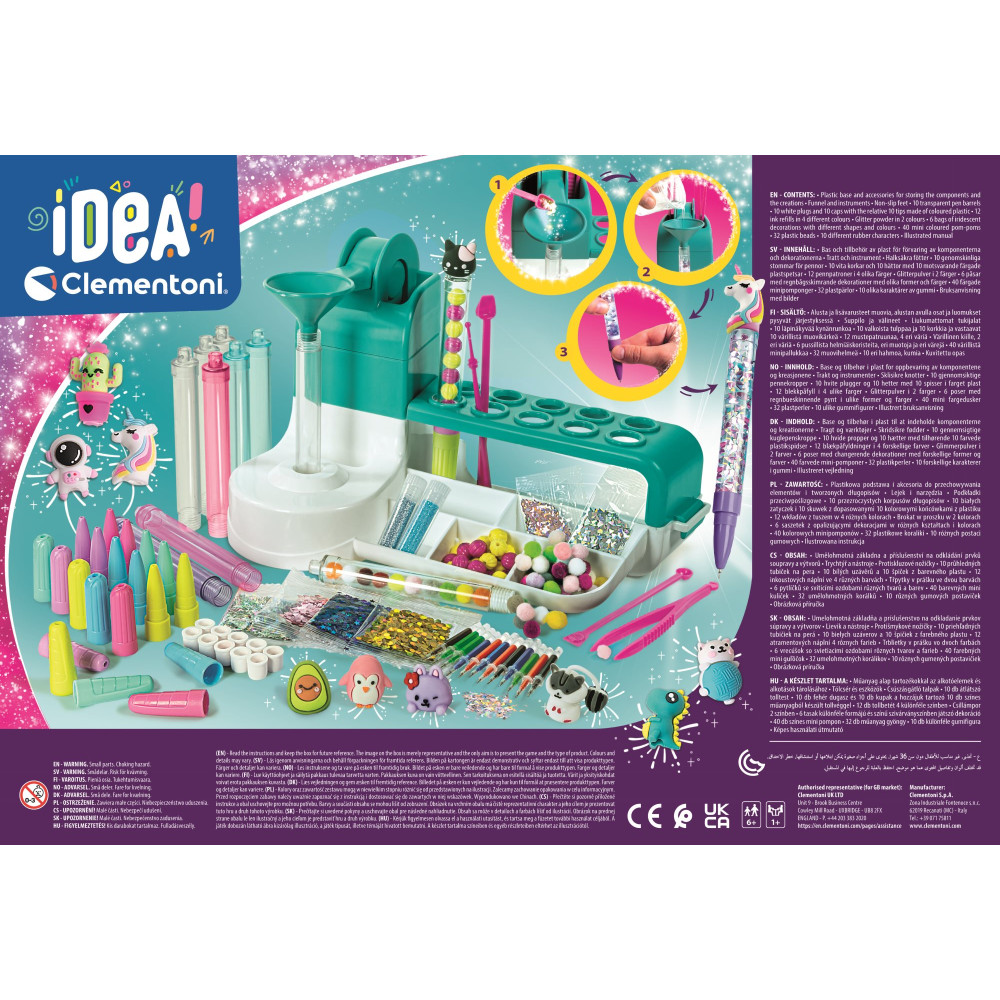 Umělecká sada Clementoni IDEA! umožňuje vytvářet si vlastní nádherná pera s mnoha doplňky a dekoracemi. Sada nástrojů pro výrobu 10 stylových per včetně různobarevných náplní podporuje kreativitu a zručnost. Skvělý dárek pro každou příležitost.