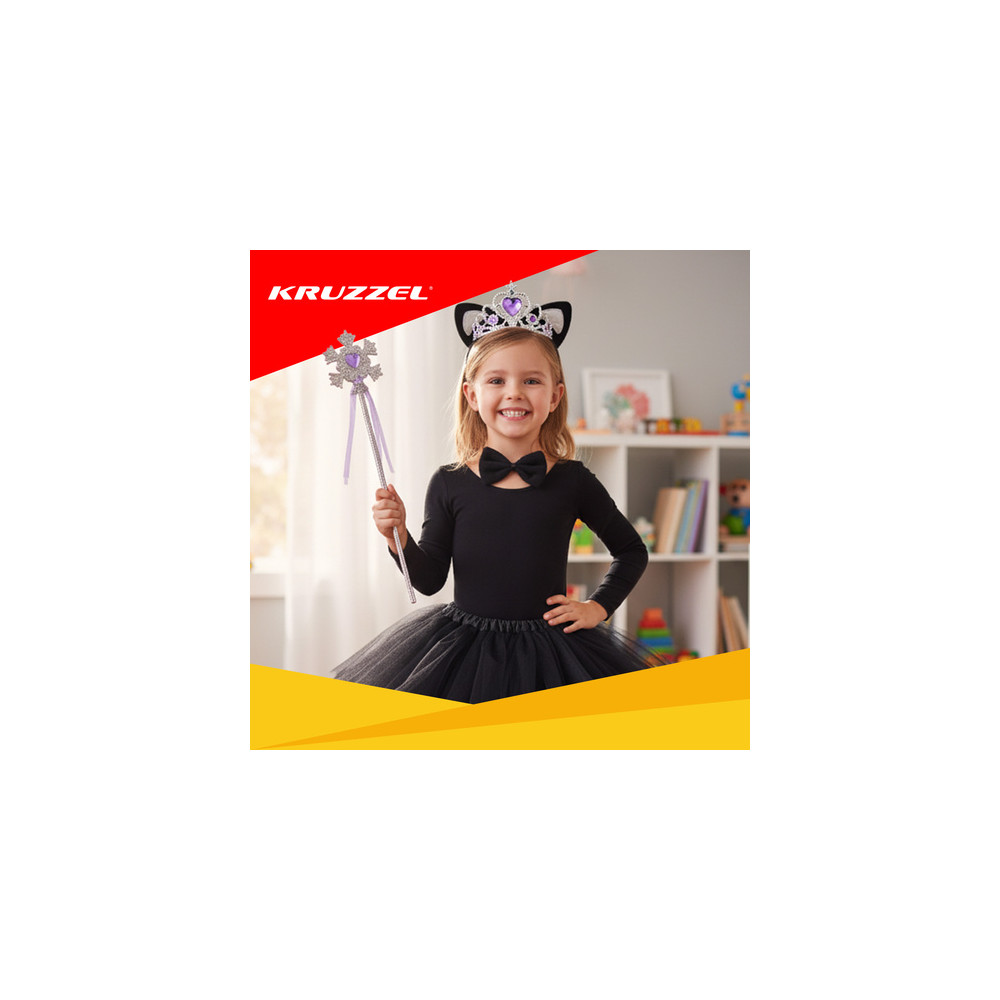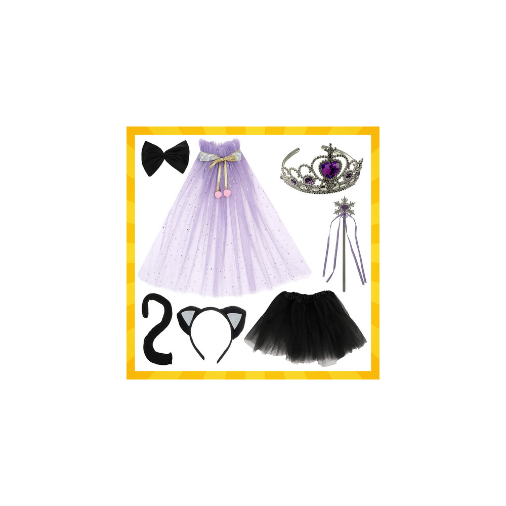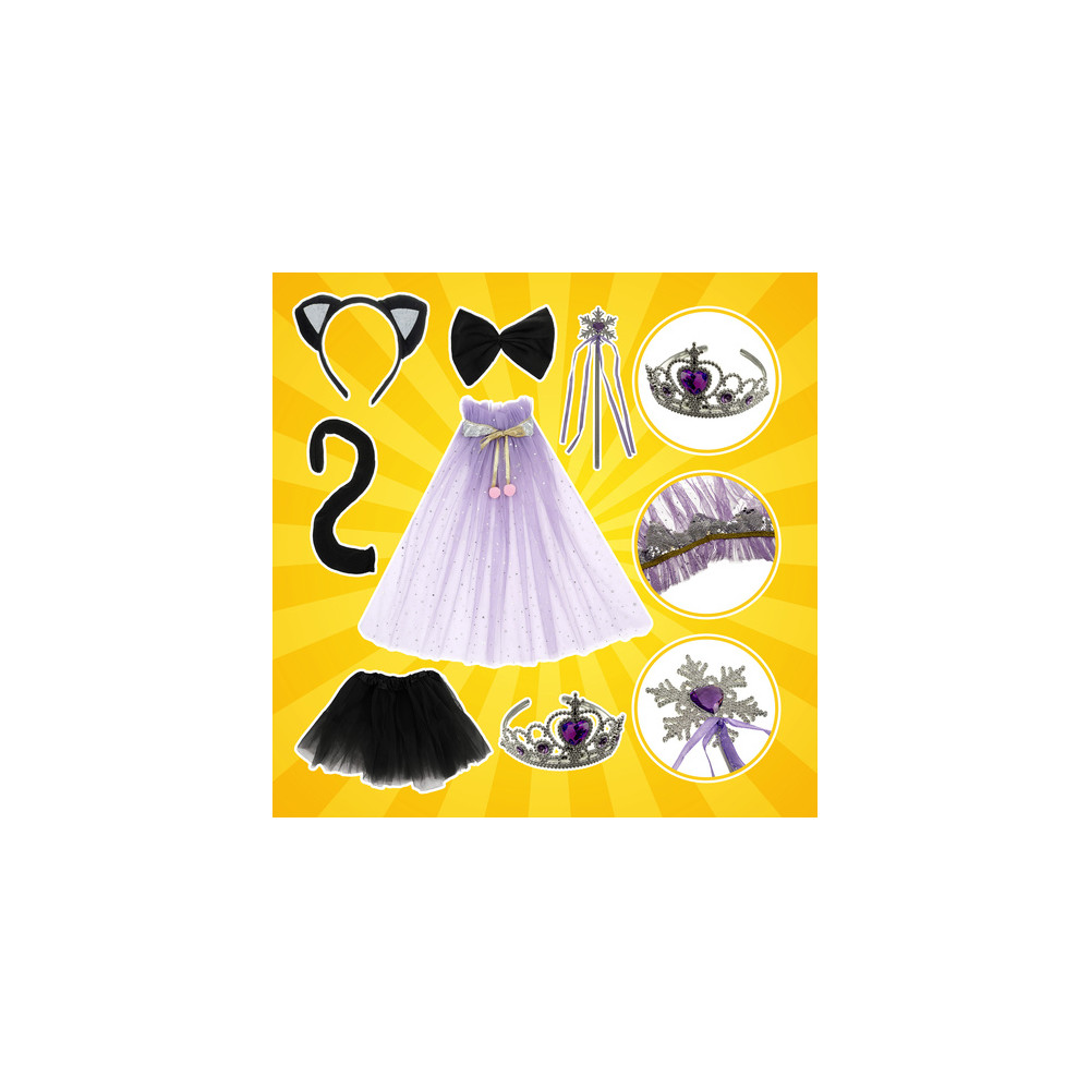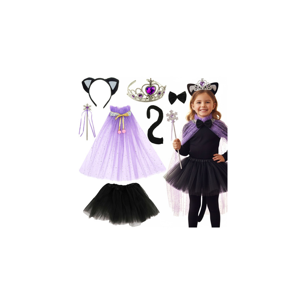 Dětský kostým kočičí princezny ve fialovočerné barvě. Je vyroben z lehkého polyesteru, který neomezuje pohyb dítěte.