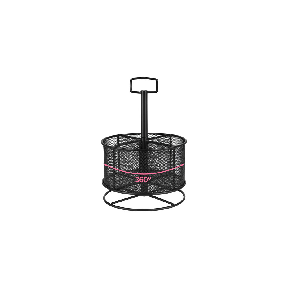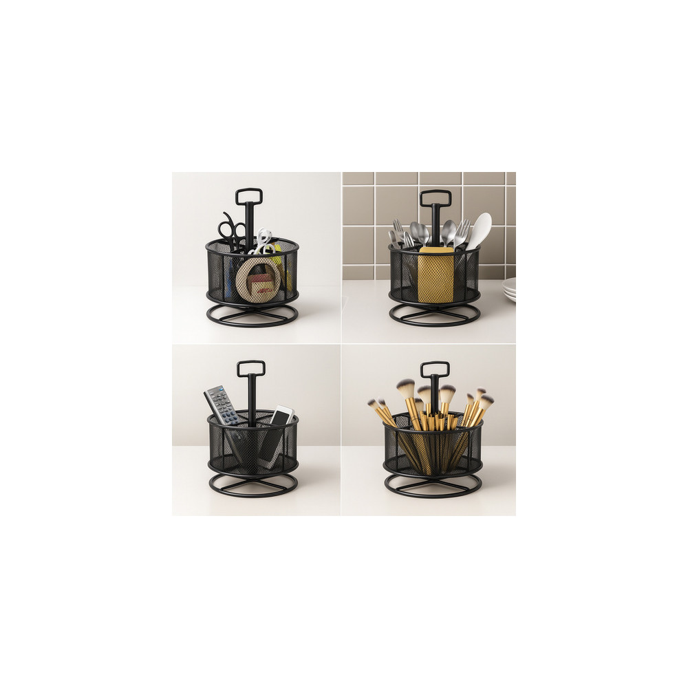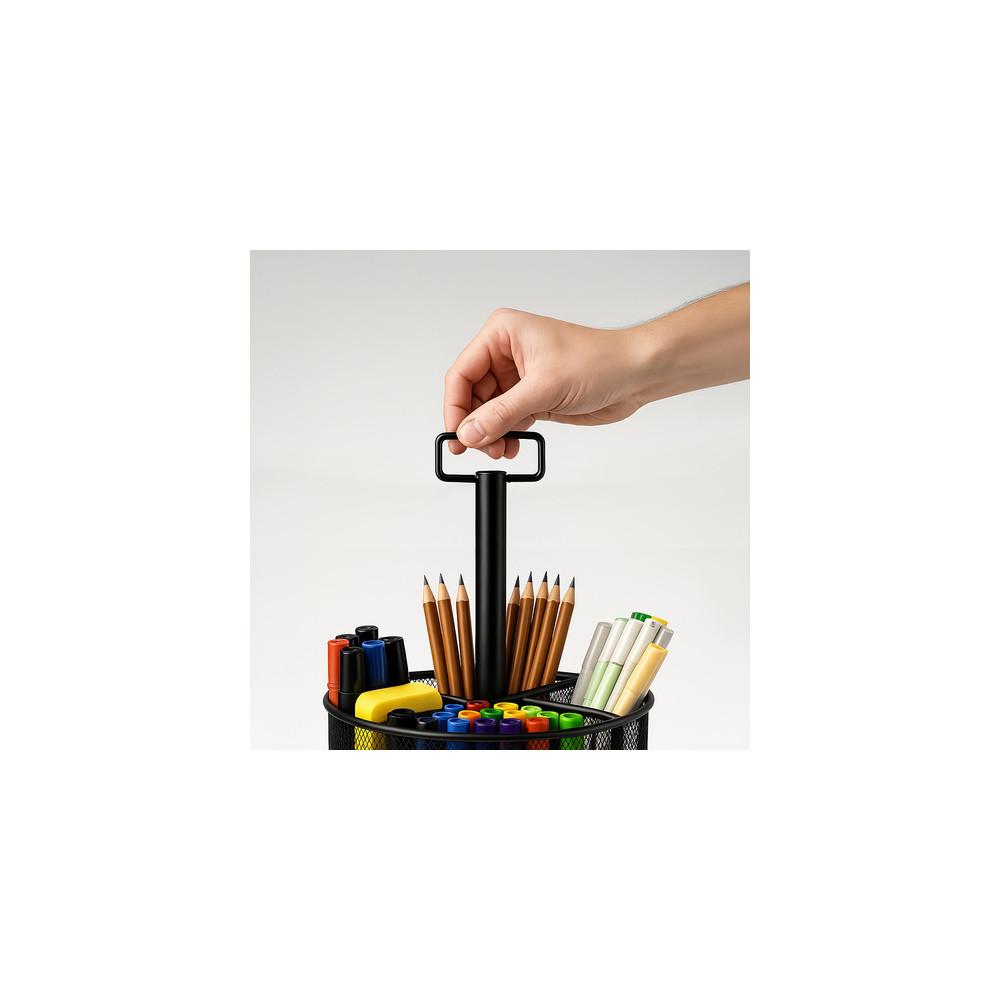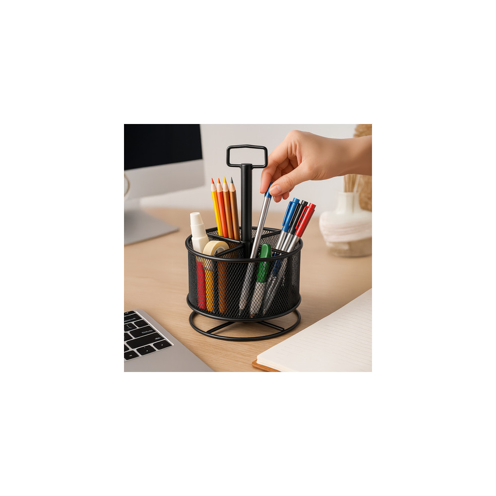 Praktický otočný organizér vhodný na psací potřeby a jiné pomůcky. Perfektně se hodí na menší pracovní stůl nebo do kanceláře. Jeho otočný design šetří místo a zároveň umožňuje rychlý přístup ke všem přihrádkám. Díky čtyřem jasně odděleným částem můžete snadno třídit pera, tužky, nůžky, pravítka a další kancelářské potřeby.