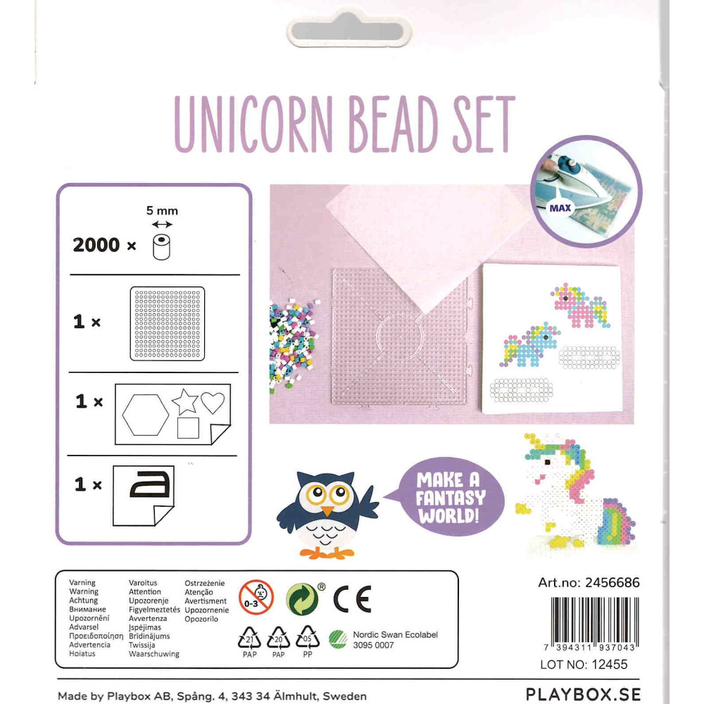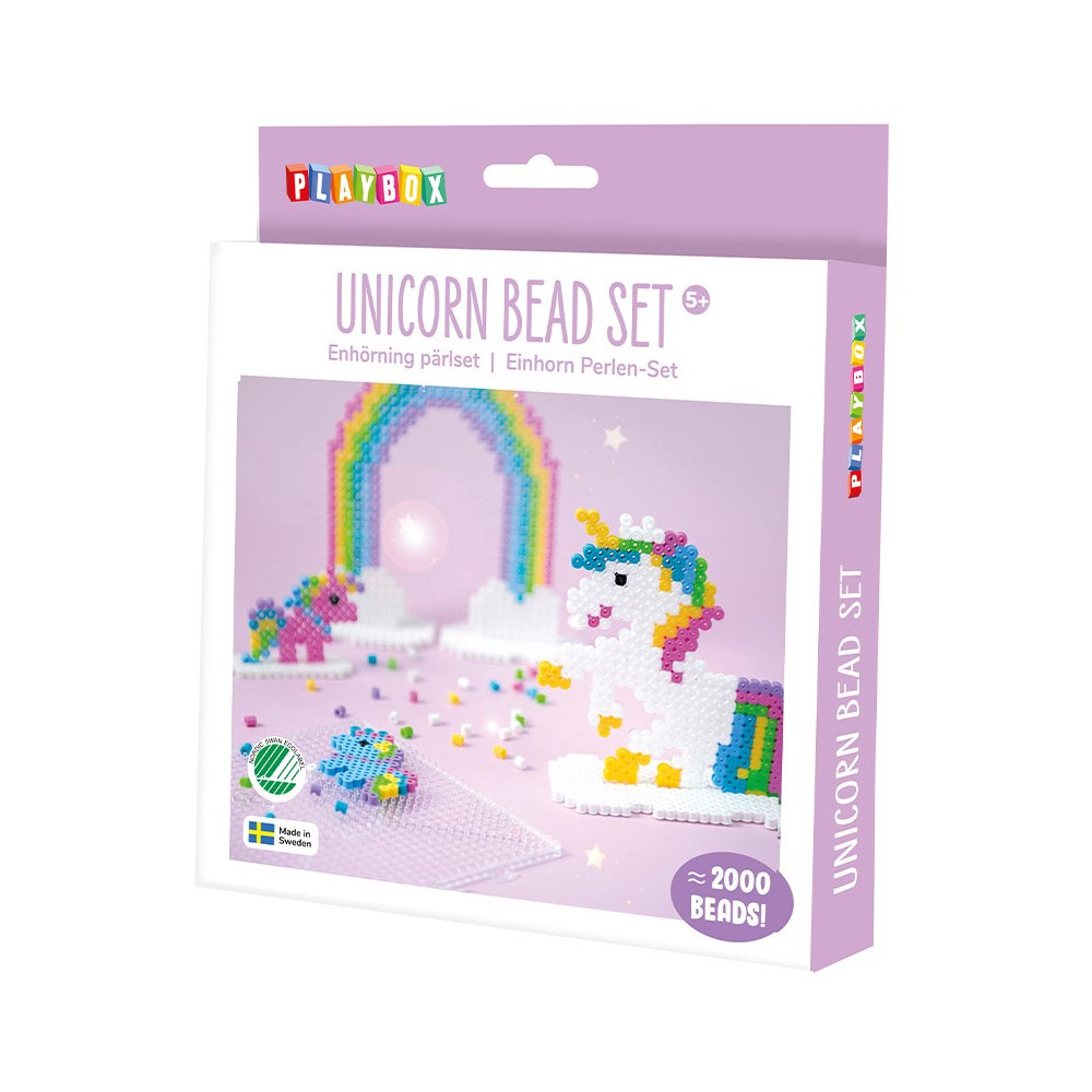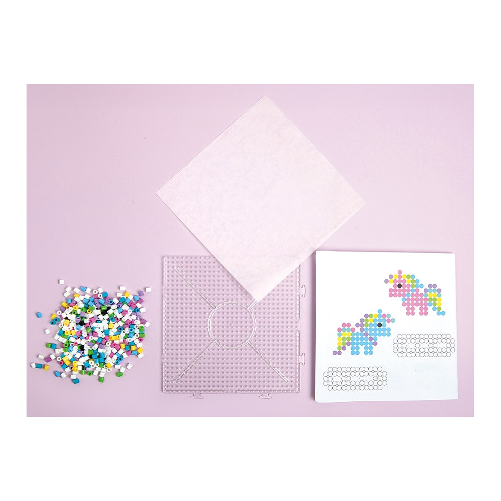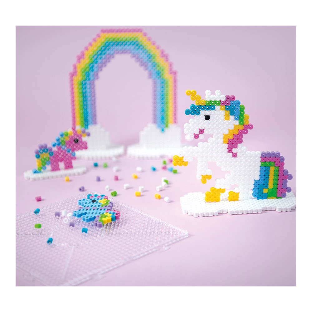 Kreativní sada se zažehlovacími korálky, která obsahuje barevné korálky a předlohy pro vytvoření duhového světa plného jednorožců.