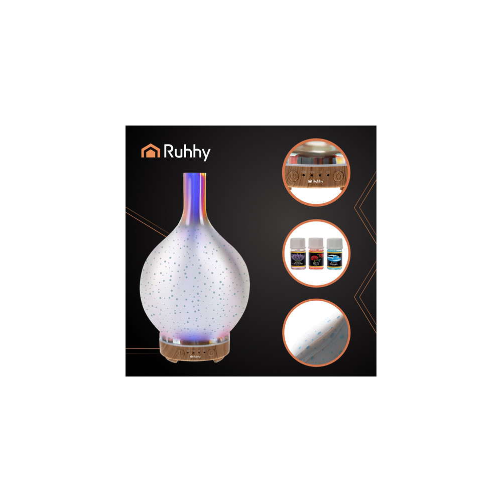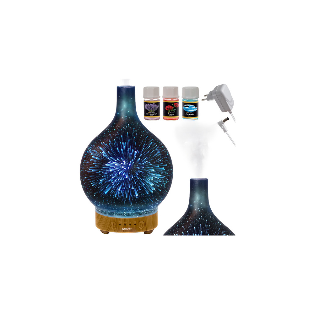 Difuzér a aroma zvlhčovač vzduchu s LED noční lampou. Moderní vzhled zapadne snadno do každého interiéru. Sada obsahuje 3 esenciální oleje vhodné pro použití do tohoto aroma difuzéru. Oleje jsou rozpustné ve vodě. Zvlhčovač má vestavěný časovač, který zapíná zvlhčování buď každých 30 sekund, každou hodinu nebo každé 2 hodiny. Lampa svítí dohromady 7 barvami se 14 odstíny.