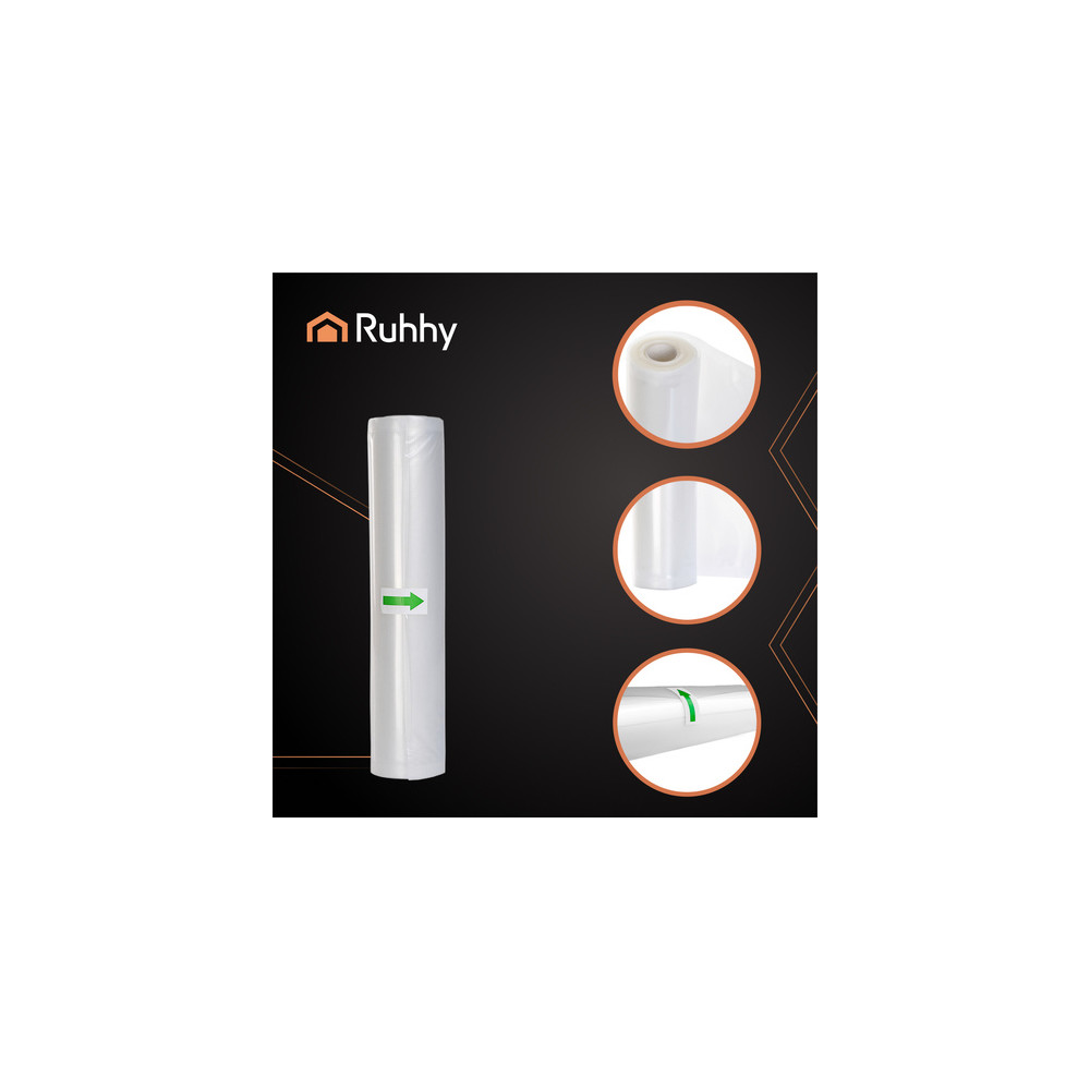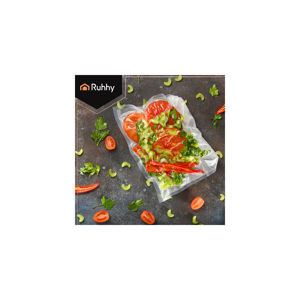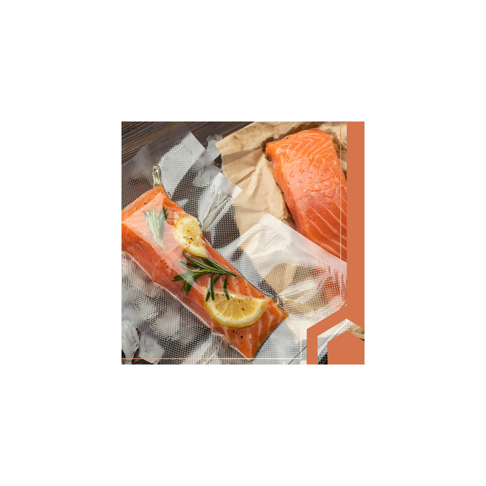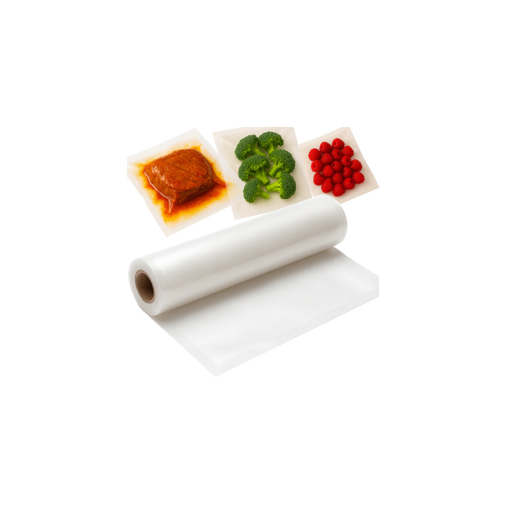Těsnící vroubkovaná fólie se speciálním hlubokým reliéfním vzorem, který odsává vzduch a je mnohem rychlejší a pohodlnější než běžná fólie. To znamená, že na jedné straně má hluboký reliéfní vzor a na druhé straně je zcela hladká a průhledná. Navíc přesně přilne k produktu, díky čemuž šetří místo v lednici nebo mrazáku.